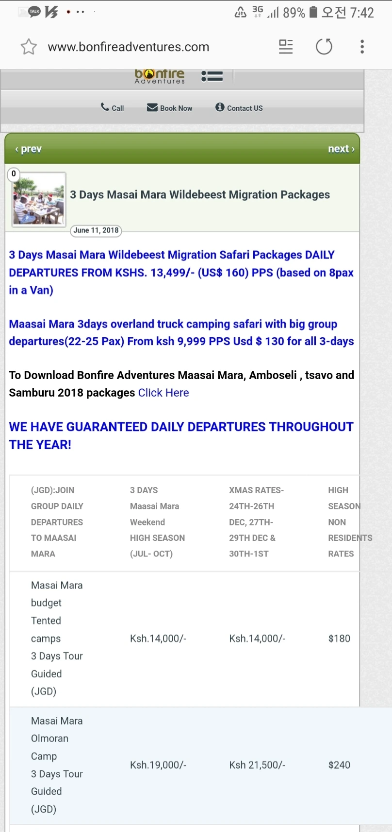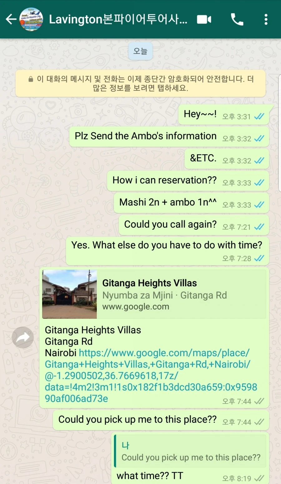 여기 투어도 나쁘진 않았지만 개인적으론, 한국인들이 많이 간다는 현지 여행사 ㅂㄹㅅㅍㄹ 투어를 추천한다. 당시 케냐에서 한인민박, 게스트하우스 운영으로 유명하신 터줏대감 ㅇㅈㅇ 사장님이 예약을 대행해 주신다고 했다. 이런 곳을 통해 하는 게 보통 가장 안전하기도 하고 여행도 잘 챙겨주시며, 열악한 현지에서 자릴 잡아오신 이 분께 도움을 드릴 수도 있는 좋은 방법이다. 예상대로 투어 후 내용을 다 찾아보니 입장료까지 포함해 250달러이고, 숙소로 제가 갔던 텐트랑 별반 차이가 없었던 거 같다. 또 한국인 분들이 거의 같이 갈 테니 여럿이서 활동하며 하는 사진 촬영, 한국인에 맞는 식사 구성 등으로 장점이 많을 거라고 생각한다.