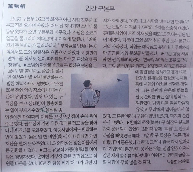 얼마 전 지인 모임 식사 자리에서 LG그룹에 다니는 친구가, 밑줄 친 그대로 종업원 아주머님께 행했었다. 별 대수롭지 않게 넘길 수도 있었겠지만, 난 그걸 보며 '아주머님 고생 많으시지...' 생각했었는데 이렇게 또 신문에 나와 그게 구본무 회장님 습관이었구나! 싶었다. 그건 그 회사에 다니는 그 친구에게까지 파장이 미친 것으로 생각한다.
