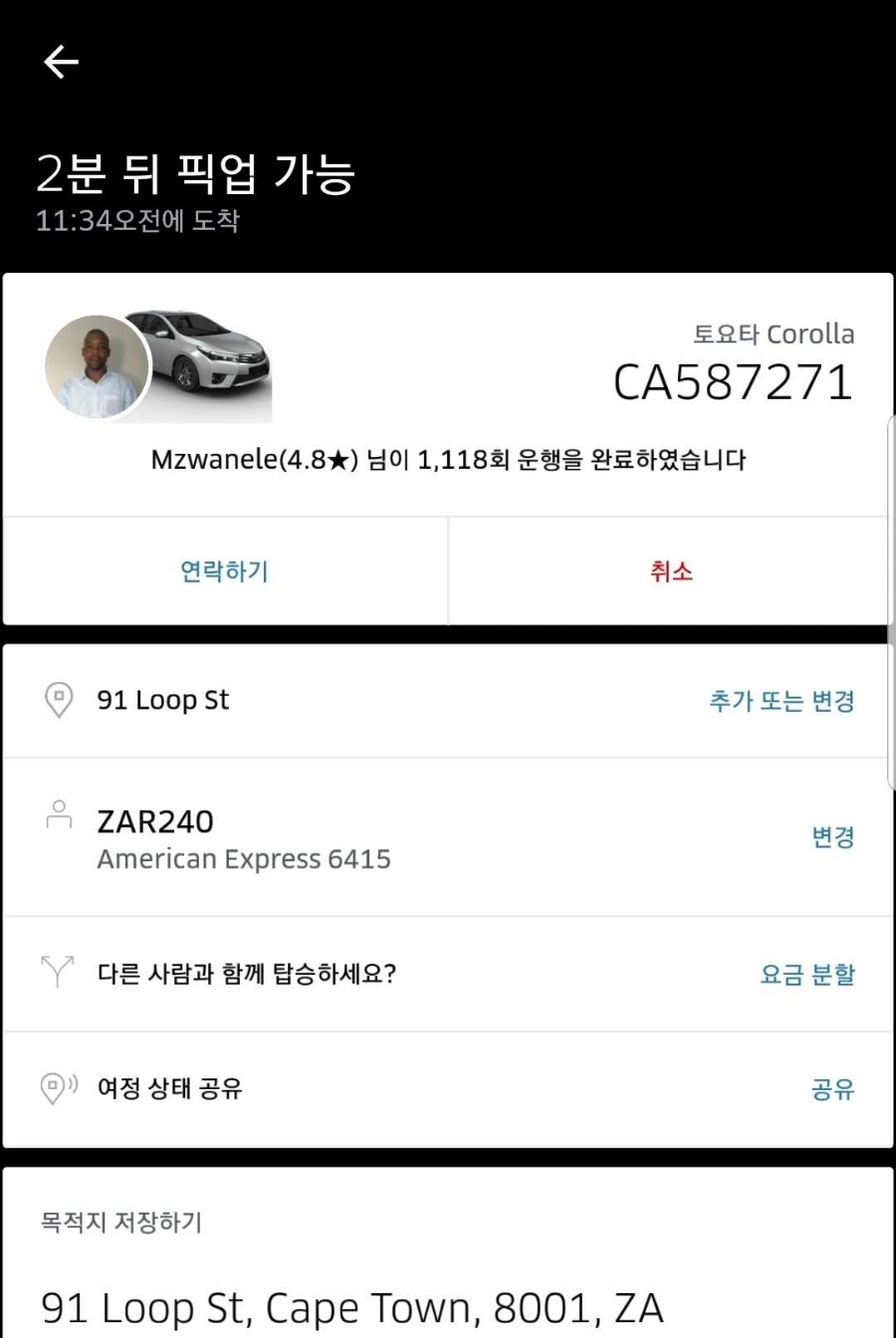 남아공, 적어도 케이프타운에서 내가 다녀본 구역들은 와이파이를 무료로 실내에서 쓸 수 있는 공간도 찾기가 쉽지는 않았다. 그래서 이 카페에서 쉬면서 쇼핑할 것들을 좀 찾아본 것. 이내 리스트를 다 정한 후, 다시 우버로 기사를 불러 차에 탑승한 후 시내 숙소로 향했다.