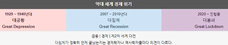 <나무위키>에 정리된 것에 따른, 역대 세계 경제 위기 분류(다만 어떻게 분류하느냐에 따라 불리는 명칭은 다를 수 있다)