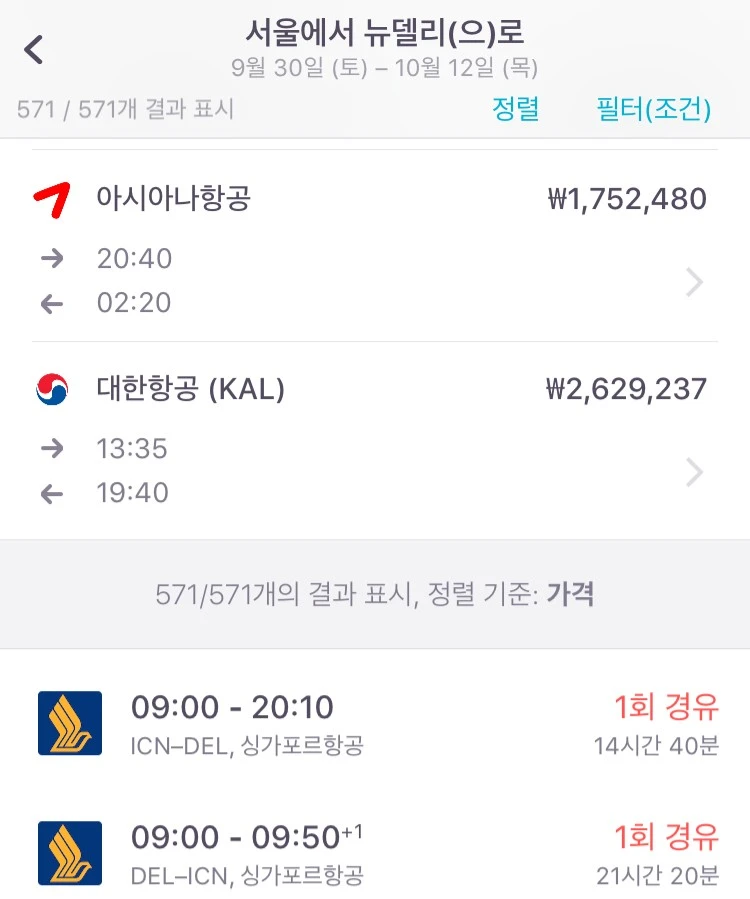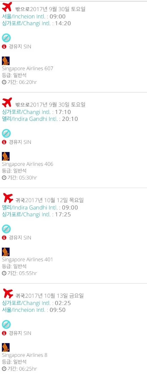 델리행 티켓의 직항과 경유의 차이 / 싱가포르 항공 비행기
