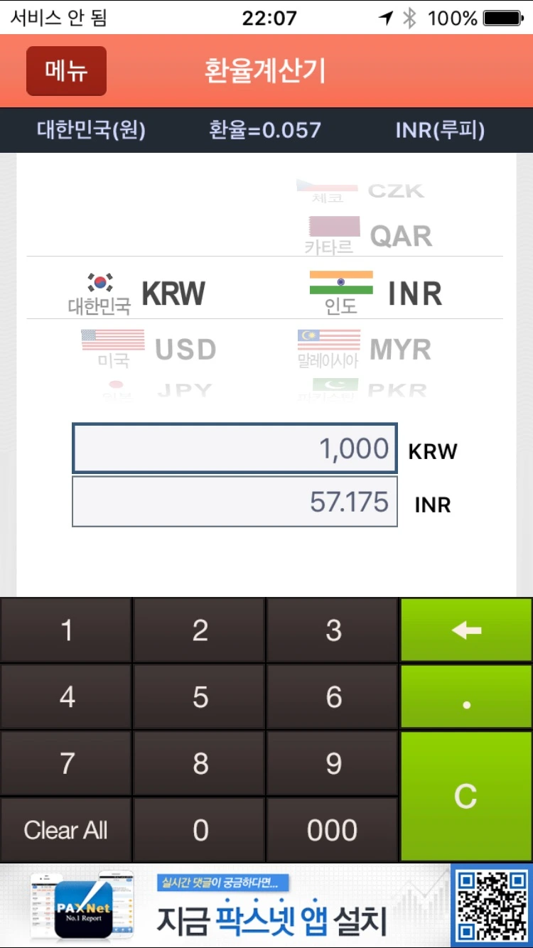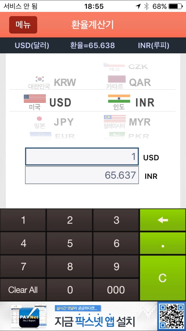 한국 원 및 미화 대비 루피(INR) 값도 체크 필