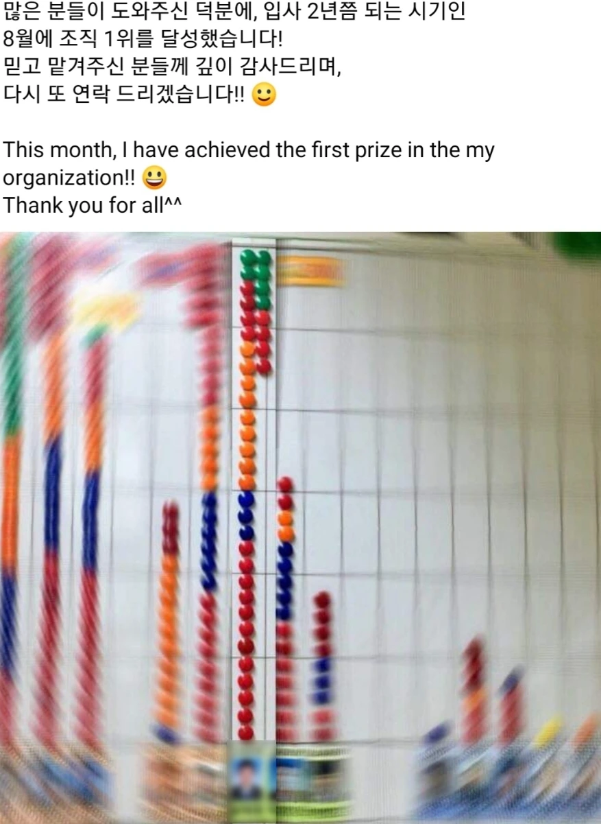 회사에 입사한 이래 그 달에 난, 그간 열심히 씨앗을 뿌리고 고객 관리하면서 일했던 성과를 보상받았던 거 같다. 조직에서 1위는 물론, 전국에서도 상위 순위에 오를 만큼 세일즈 실적을 내어 감사한 성과를 낼 수 있었다.