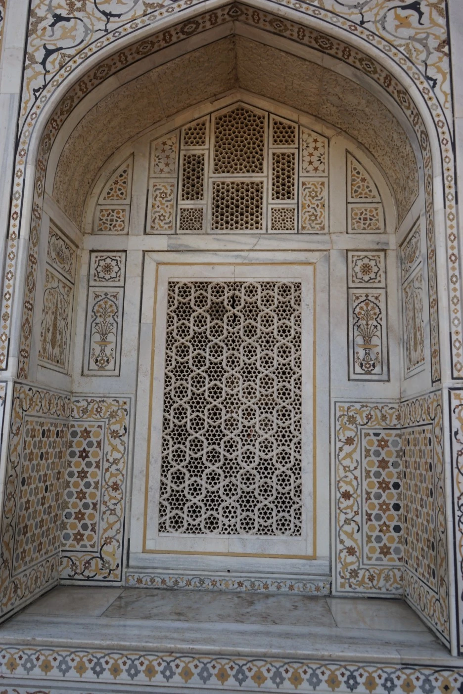 본관과 함께 이 구조는 수많은 별채와 정원으로 구성되어 있습니다. 1622년에서 1628년 사이에 지어진 무덤은 기념비적인 무굴 건축의 첫 번째 단계(델리의 후마윤의 무덤과 시칸드라의 악바르의 무덤에서와 같이 주로 대리석 장식이 있는 붉은 사암으로 건축됨) 사이에서 흰색을 기반으로 한 두 번째 단계로의 전환을 나타냅니다. 타지마할에서 가장 우아하게 구현된 대리석과 돌 등으로 구성되었습니다.