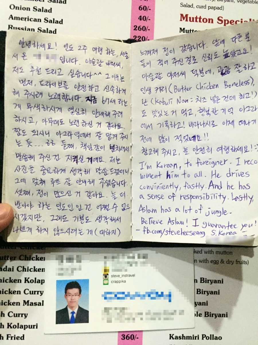 식당에 와서 숨을 돌리면서, 어르신과 난 대화를 이어갔다. 아까 제대로 못 본 한국인들 그리고 외국인들도 적어준 후기들을 찬찬히 읽어보면서, 어르신을 선택한 게 잘했을 거라는 생각이 들었다. 이 어르신은 대부분 아그라에 하루 혹은 나절만 둘러보고 갈 여행자들에게 사기 치는 대신, 장기적으로 생각해 책임 있게 그들을 대하면서 저런 후기들을 쌓아올 수 있었을 것이다. 즉 신뢰를 바탕으로 당당하게 모객을 할 수 있는 이 징표를 꾸준히 그간의 여행자들에게 받아온 것. 이 내용이 아니면 내가 이 분을 어떻게 믿을 수 있겠는가? 그걸 잘 아시고, 또 여기 식당에 와서도 그런 내용들을 궁금해하는 내게 친절하게 다 설명해 주셨다. 그러면서 이분께 더욱 정과 신뢰가 갔던 것으로 기억한다.
