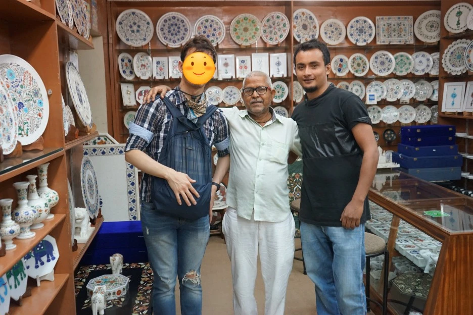 이제, 유적지들이 다 닫은 시간까지 관람하는데 안내해 주신 아슬람 어르신의 드라이버 입무는 거의 다 끝났다. 바라나시행 버스 픽업 장소까지 가는데 여유 있게 3시간 정도가 남아서, 난 못 이긴 척 기념품 장소로 데려가 달라고 했다. 그날 하루, 편하게 내가 원하는 일정대로 잘 안내해 주셨기에 이분과 협약을 하고 계신 기념품 가게라도 가서 살 게 있으면 사드리려고.