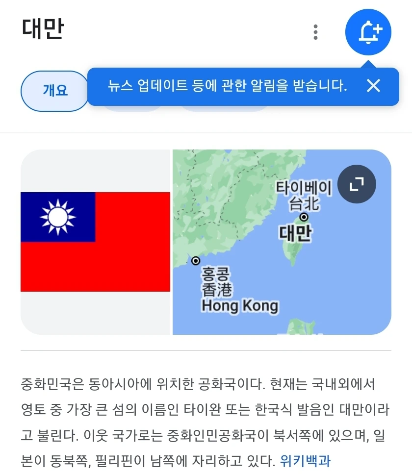 요약: 타이완 해협을 사이에 두고 중국 푸젠성과 마주하고 있는 나라로 중국 본토에서 약 150㎞ 떨어져 있다. 1885년 하나의 성(省)으로 독립하였고, 청일전쟁 뒤 일본 최초의 해외 식민지가 되었으며, 1949년 중국 공산당과의 내전에 패배한 국민당의 장제스 정권이 이전해 와 성립된 국가이다.