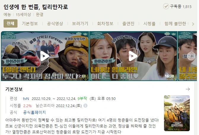 마침 최근 종영한 <인생에 한 번쯤, 킬리만자로; tvN>까지 재밌게 봤을 때, 이 프로가 시작해 지난 내 여행(아프리카 역시 종단)의 오감을 대체할 콘텐츠를 찾아 집에서 TV를 잘 안 봤던 나에겐 추위를 녹이면서 행복하게 즐길 수 있는 요즘이다. 이 방송은 아프리카 대륙에서 가장 높은 산인, 정상인 우후루 피크의 높이 5,895m에 이르는 '킬리만자로'를 연예인 4인 윤은혜, 손호준, 유이, 효정(가수 오마이걸)이 등반하는 도전기를 그렸다.
