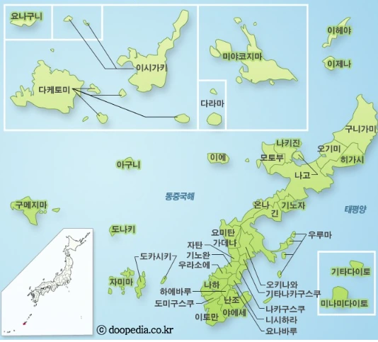 요약: 일본의 난세이제도[南西諸島] 남부의 류큐제도[琉球諸島]에 속하는 섬들을 포함하는 현.