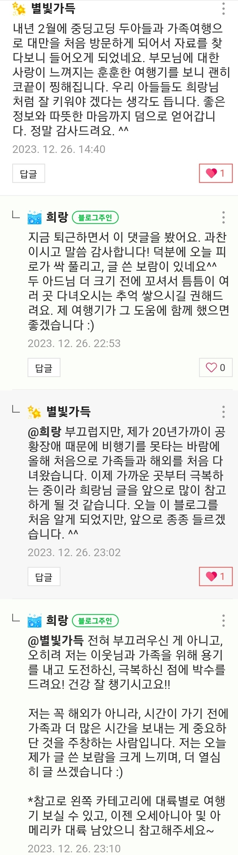 하루 업무를 마치고 귀가하는 길에 발견한 내 여행기의 보람을 느낀 댓글.20여 년의 공황장애를 이겨내고 두 아들과 여행하기 위해 노력하시는, 한 여성분이 친히 이런 덧글을 남겨주셔서 글을 쓰는 보람을 다시 느꼈다. 나에 대한 칭찬의 말씀 보다도, 보람있는 말씀으로 얻는 힘이 상당히 값지다.