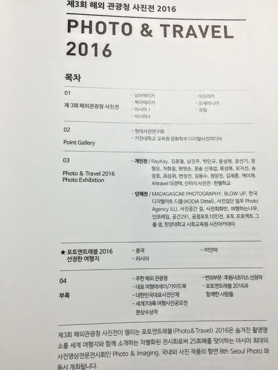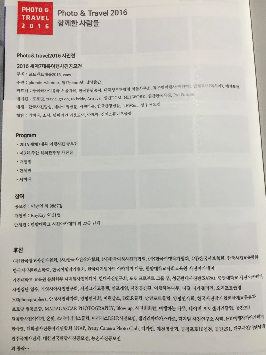 지금 생각해봐도 이 행사의 전시기획은 참 괜찮았다고 생각된다. 먼저 누구나 직접 촬영한 여행 사진으로 이 행사의 공모전에 도전할 수 있었는데 첫째, 동시에 그 사진의 액자 제작비만 후원사인 액자 회사(당시 라미나로 기억)에 지불하면 액자를 제작해주는 것은 물론이고 원하면 이렇게 코엑스 전시장 한 켠에 작품을 전시해주었다. 둘째, 전시자인 내가 항상 상주해있지 않아도 나를 보러 오신 참석자 분들이 내 사진을 포함해 다른 작가분들의 다양한 작품을 보면서 세계 곳곳의 여행 풍경을 볼 수 있다는 점도 좋았다. 마지막으로 셋째, 전시된 내 작품을 포함해 다른 분들의 작품들까지 다 포함된 도록까지 제작되어 받을 수도 있었으니 일석 삼조 아니 다조라고 생각한다. 그렇게 난 나의 첫 전시회를 단체전으로, 부담을 느끼지 않고 경험삼아 시작해볼 수 있었다.