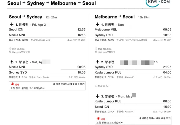 인천국제공항→필리핀마닐라국제공항→시드니국제공항