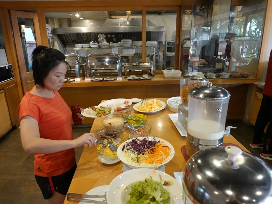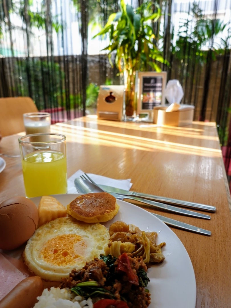 부족하지 않은 가짓수와 생각보다 괜찮은 맛에 만족이번 여행에 있어 숙소들은 3성급 이상으로 생각하여, 깔끔한 침실과 식사가 양과 질면에서 평이 좋은 곳들로 예약했었다. 내가 혼자 갔더라면 도미토리나 2~3등급의 호스텔 정도에 갔었을 거다. 아무튼 침실도 아버지 허리 등의 척추와도 연관해 생각해야 하기에 이용자 후기를 읽어보고 침대가 딱딱하다고 하는 곳은 제외, 푹신하다는 곳을 찾았고 식사를 해야 하는 곳이면 맛이 좋다는 곳으로 고르려고 했다. 그 평대로 침대도 나쁘지 않았고 특히 식사가 아버지 입맛에도 맞게 나와서 잘 드셨다. 소시지류와 태국식으로 볶은, 카파무삽 볶음밥에 쓰이는 고기와 계란도 프라이와 늘 아버지가 매일 건강식으로 아침에 드시는 삶은 달걀, 빵과 팬케이크 및 소스, 우유와 과일주스들, 시리얼, 후식으로 과일류와 커피까지... 써놓고 보니 부족한 것도 딱히 없었다. 편안한 곳에서 맛있는 음식들을 여유롭게 즐기는, 아버지와 함께 기분 좋은 조식 타임을 누렸다.