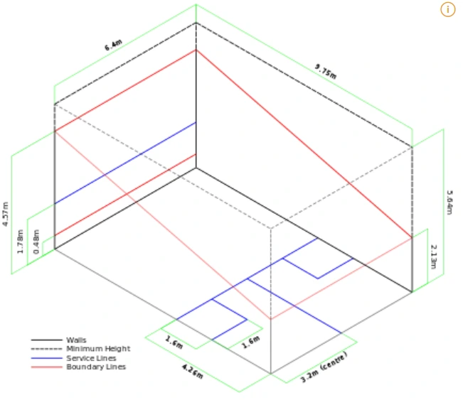 - 위 그림의 파란색 실선이 서브라인이다. 서브는 아래와 같이 진행해야 하며, 아래의 내용대로 진행하지 않을 시 상대방의 점수가 1점 올라가게 된다. (서비스 폴트)