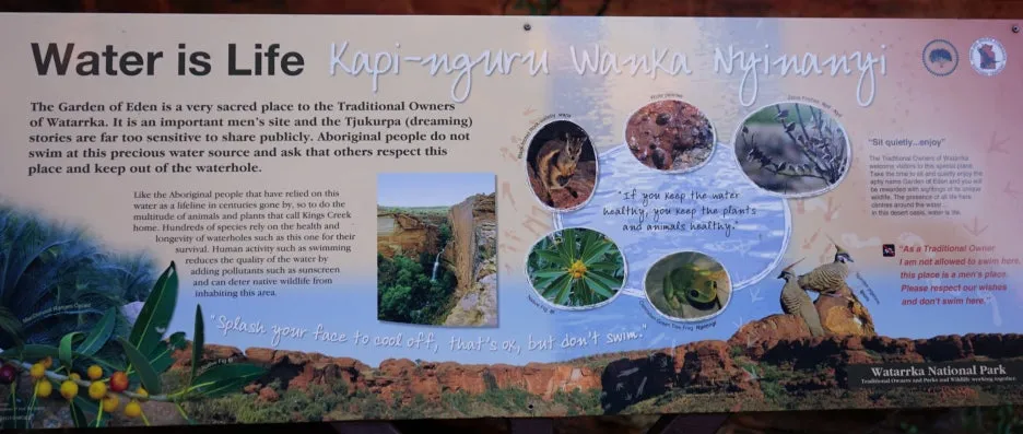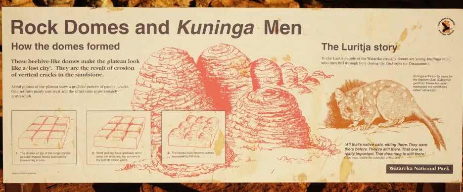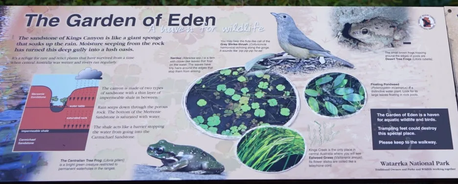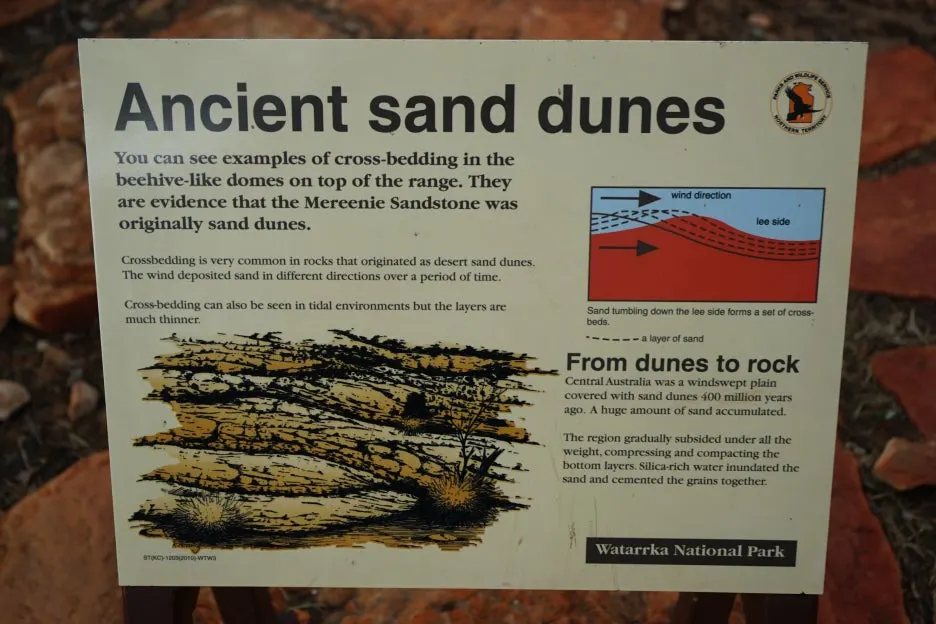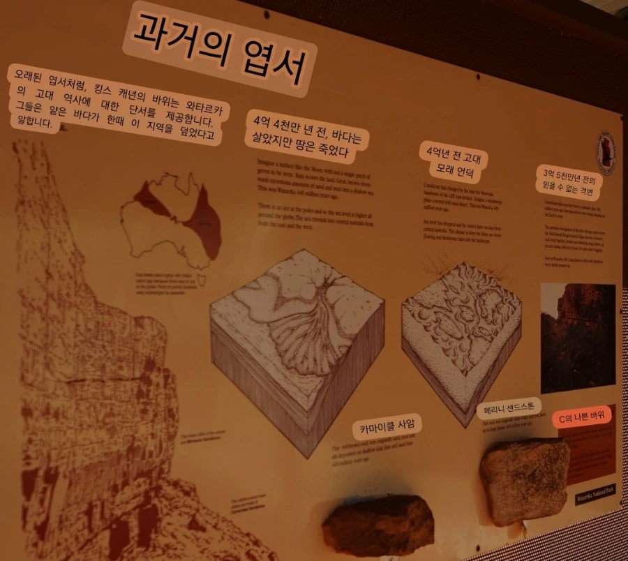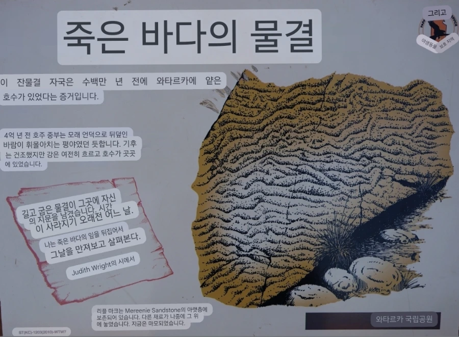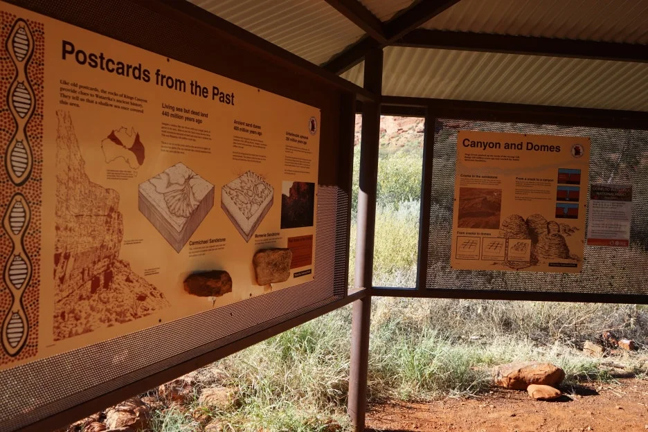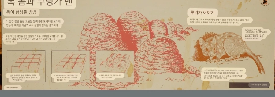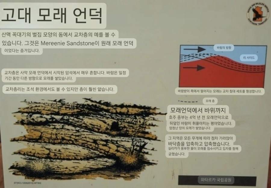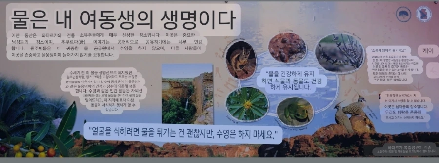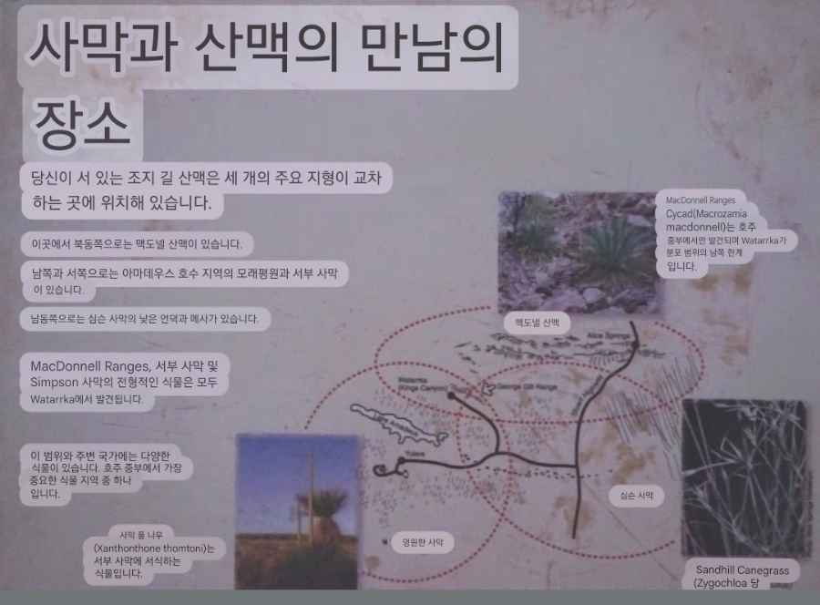 호주인인 가이드 제임스는, 이런 표지판 등에 기반하여 투어 중에 다닌 곳의 특징을 잘 설명해 주곤 했던 거 같다. 당시에 난 사진 촬영과 액티비티성 활동에 집중해선지 자연을 이해하는 지식 확장에는 큰 관심이 없었지만, 그래도 제임스가 설명해 줄 땐 최대한 귀를 기울이곤 했다. 지금 봐도, 호주의 자연 그중 중북부 사막에서 볼 수 있는 이런 모습은 다른 여행지에서 흔하게 볼 수 있는 풍경은 아닌 기억으로 각인되었다.