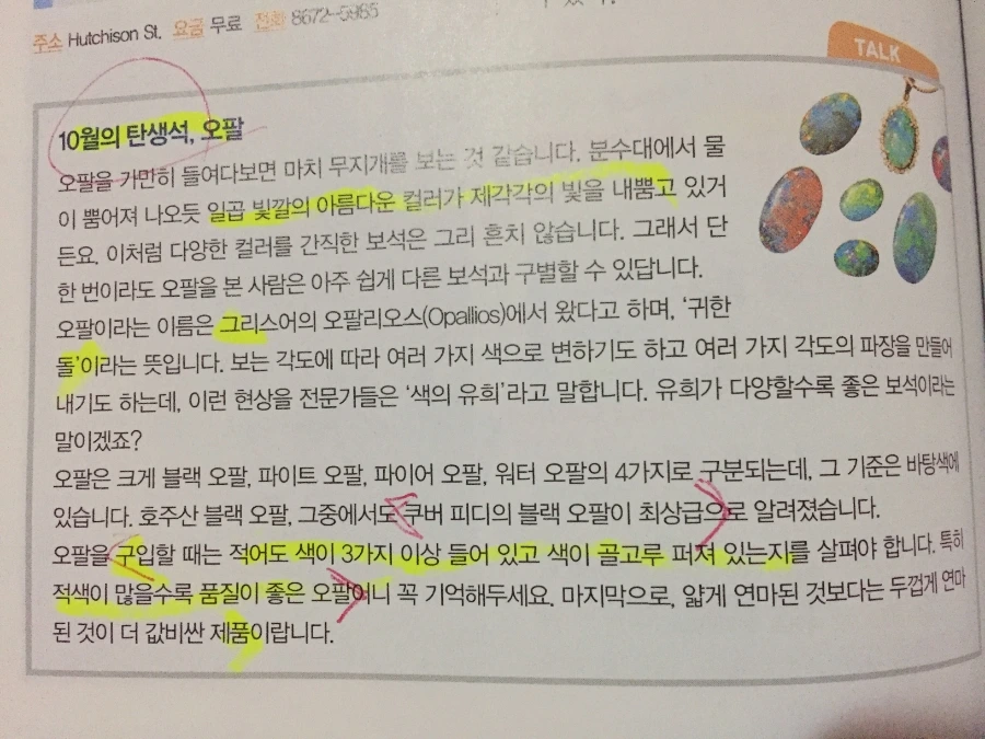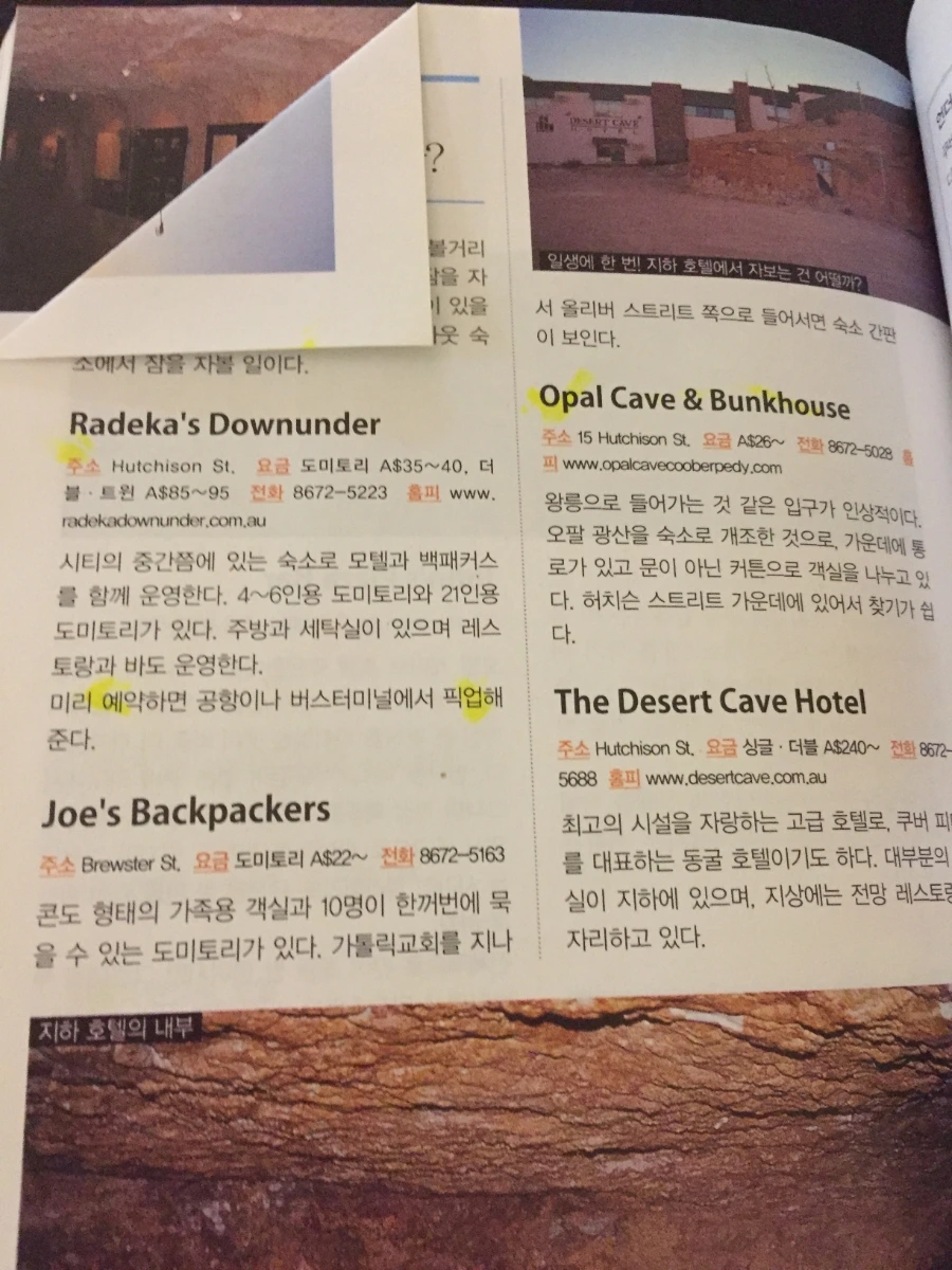 당시 이 오팔들을 여기서 구매한 후 한국에 팔 생각도 해보긴 했었다. 또한 여행 준비로 책을 보면서 형광펜과 빨간색으로까지 표시해 둔 거 보면 당시 여자친구에게 선물하려고 고민했던 거 같긴 한데 ㅡ.ㅡ... 하지만, 난 어쨌거나 이때 오팔을 구매하진 않았다. 잘한 선택이었다고 생각된다. 보석 구매는, 이용할 사람이 현장에서 진위 여부를 확인한 후 직접 착용해서 맘에 든다면 구매해도 되겠지만 그게 아니라면 별로 추천하진 않는다. 금이라면 추후 팔기에 괜찮겠지만, 그 외의 보석은 처리하기 쉽지 않다고 생각되기에. 구매할 제품은 가치가 있도록 이용해야 한다고 생각한다.