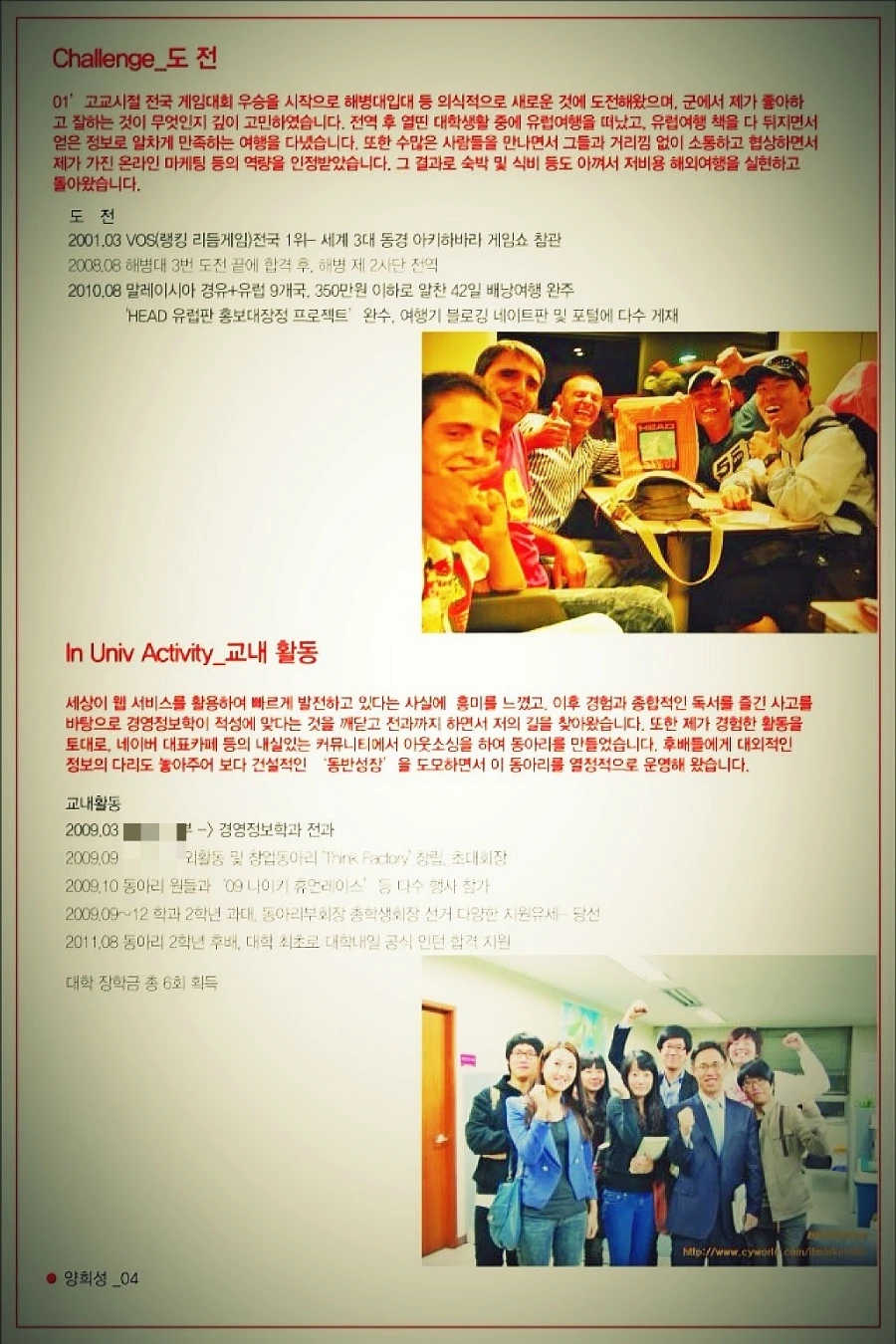 나를 소개하는 명함 및 포트폴리오 파일을 만들어 활용하기도 했다. 여행을 준비하고 진행하는 과정에서 누구의 도움을 받아 그 여정을 이어갈지 몰랐기 때문에 그에 대한 대비 차원이었다. 난 누구이며 어떤 생각으로 여행을 떠나기 전에 한 대학 생활 활동 및 왜 여행을 떠났는지 누가 보더라도 쉽게 정리해 두었다.