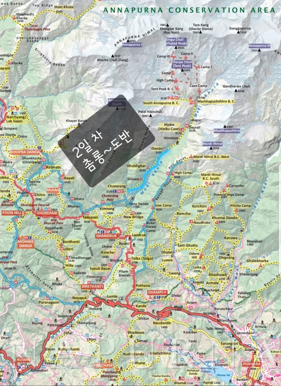 촘롱(2,150m)-> 시누와(2,360m)-> 밤부(2,300m)-> 도반(2,500m)-> 어퍼도반(2,600m) 숙박