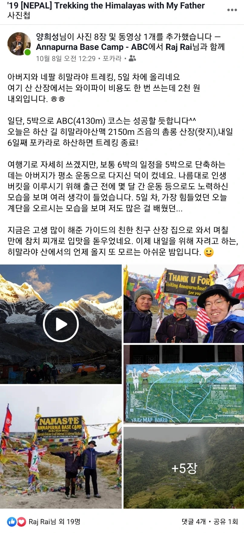 말과 글은 힘이 세다. 얼마 전부터 난 꼭 아버지를 모시고 히말라야에 오겠다고 누누이 주변에 말을 하고, 이렇게 기록을 해두었었다. 결국, 이렇게 올해 그리고 평생의 버킷을 이룰 수 있어 너무 가슴이 벅차게 감사하고 행복했다. 도와주신 분들께도 감사했던 생각이 다시금 들었던 때.