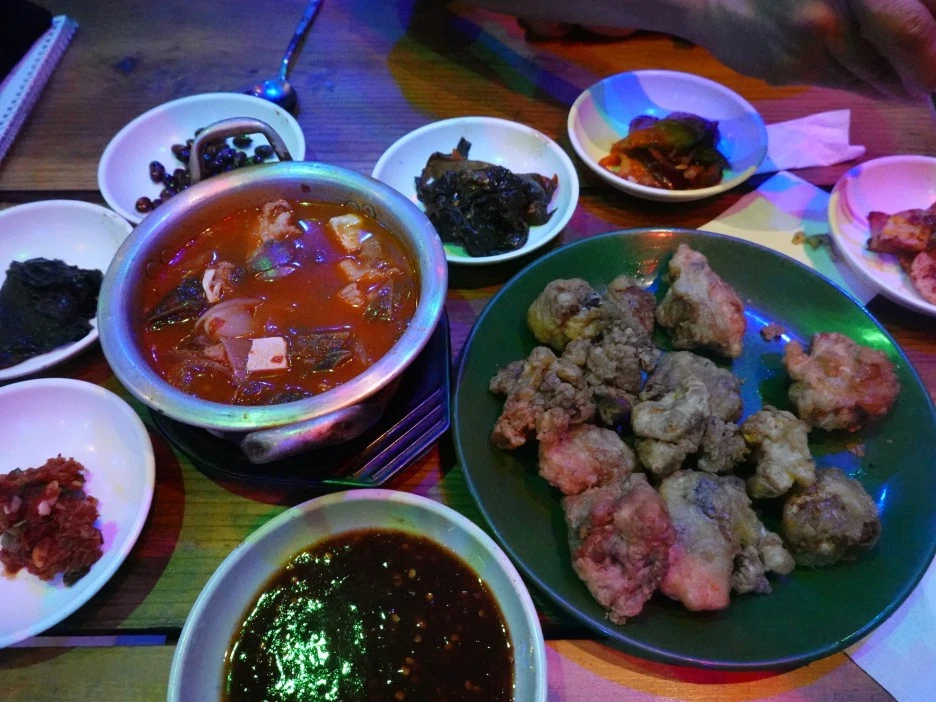돼지고기 김치찌개 1인분(밥 많은 한 공기와 저 반찬들)과 통닭 1인분(반 마리였던 듯)