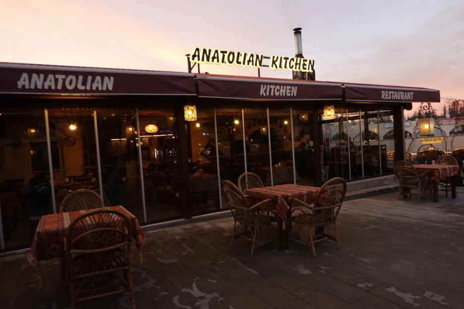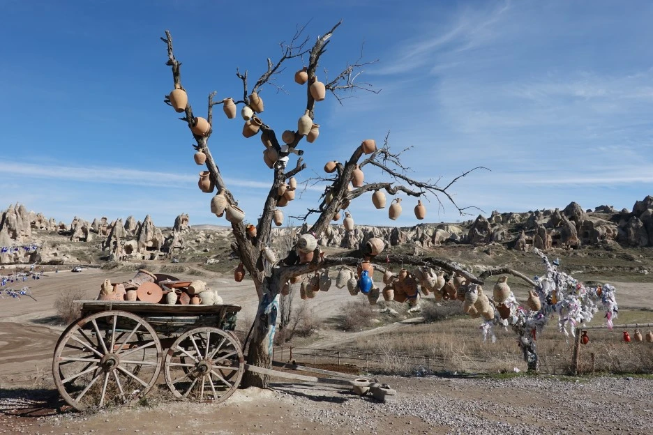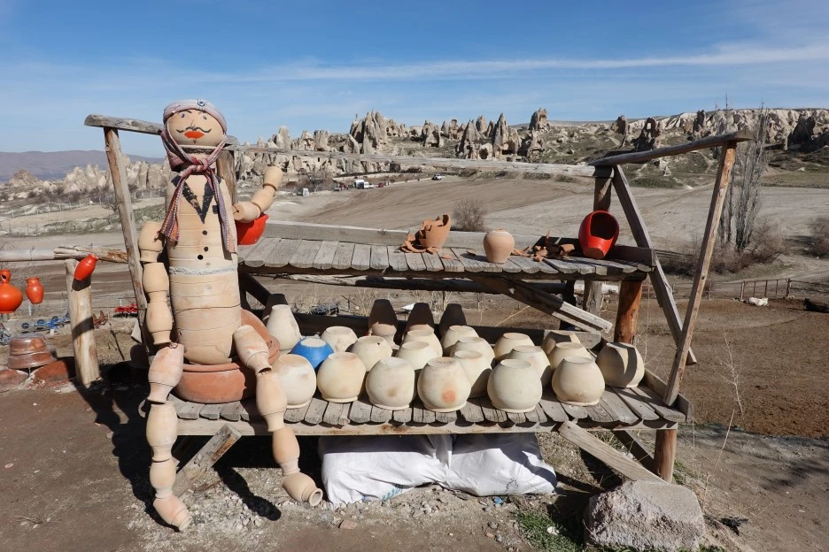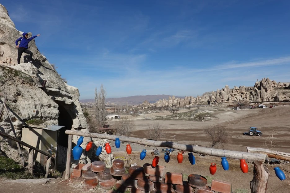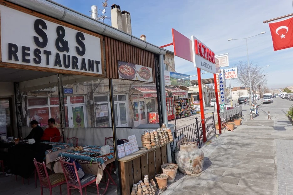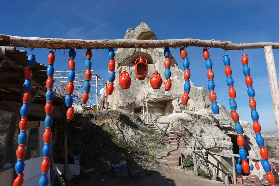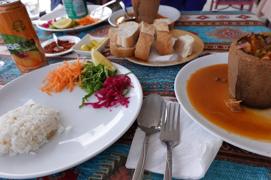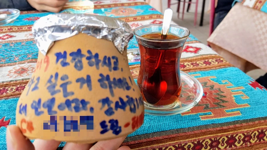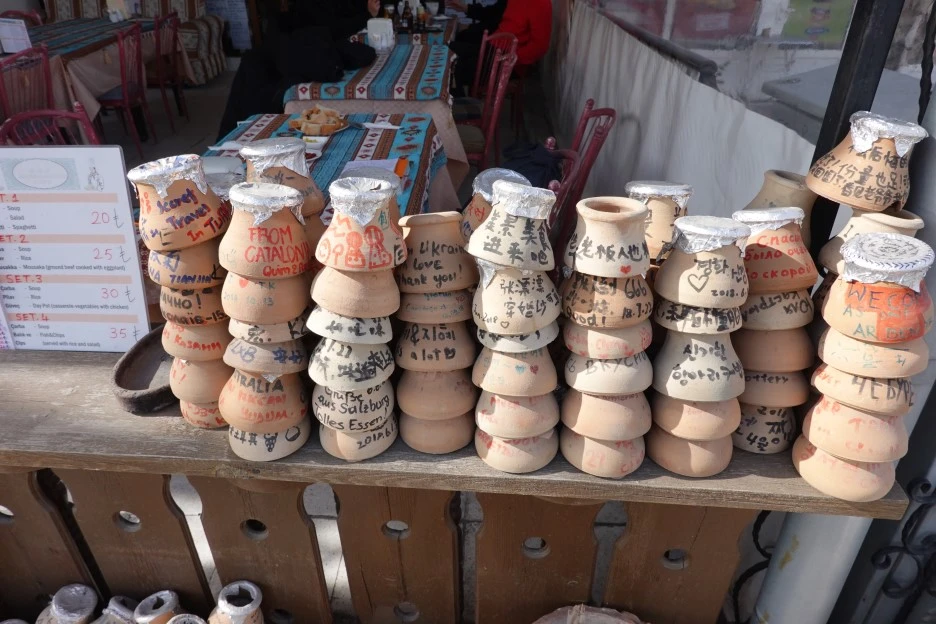 어느새 점심때가 되어 허기가 져서 괴레메 시내로 돌아와 음식점을 찾았다. 이곳은 역사가 30년이 넘었다고 들은 거 같다. 나이가 지긋하신 동네 할아버지 같으신 사장님이 입구에 들어서자 우릴 잘 맞아주셨다. 가게 앞에는 이렇게 인근 타운 도자기로 유명한 아바노스의 작은 도자기들을 다 여기에 모아놓은 듯한 진풍경이 펼쳐졌다. 수십 연 간 손님들이 '도자기 케밥'을 먹은 그 도자기들에 기록한 소중한 내용들을 볼 수 있었다. 여기선 '국물 있는 한국식 뚝배기'를 시켜 다소 느끼했던 속을, 얼큰하게 풀리는 찌개같은 음식으로 속을 좀 달래고 든든하게 해주었다.