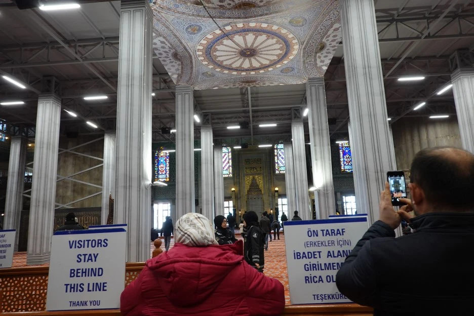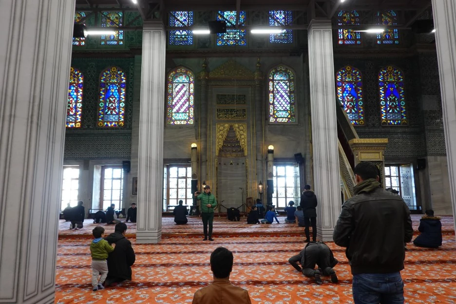 푸른 모스크에서는 1만 명 이상이 예배를 드릴 수 있으며, 수백 명의 무슬림들이 여전히 이 장소에서 하루 다섯 차례씩 매일 기도를 올리고, 금요일이나 무슬림 축제 기간 중에는 더 많은 이들이 찾는다. 예배를 드리지 않는 사람은 북쪽 현관으로 들어가야 하는데 서쪽 현관이 가장 눈부시게 장식되어 있다.
