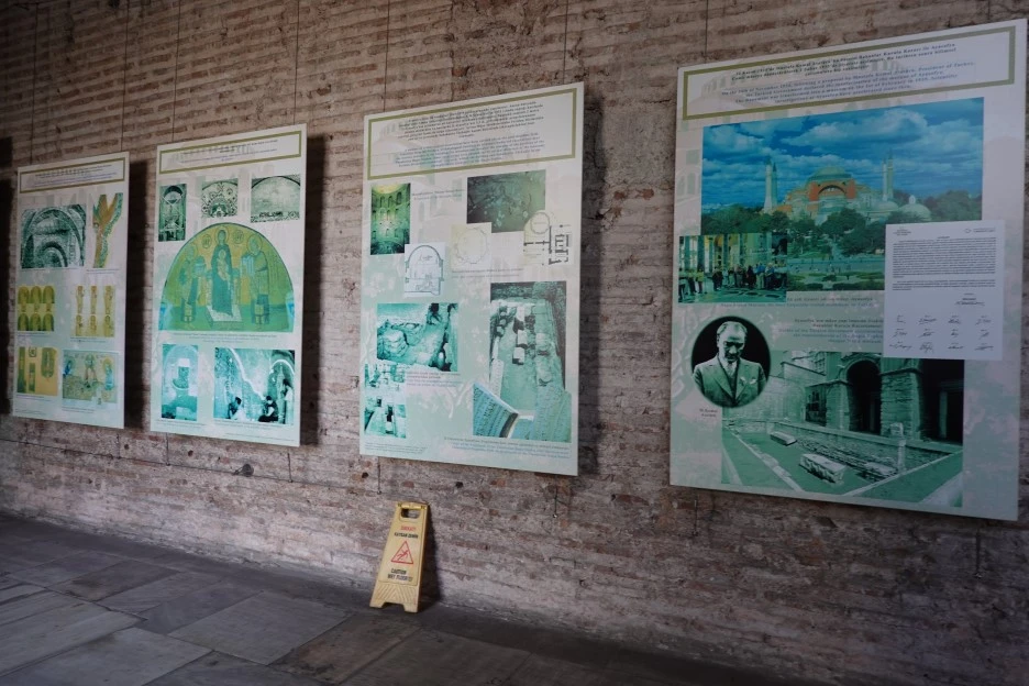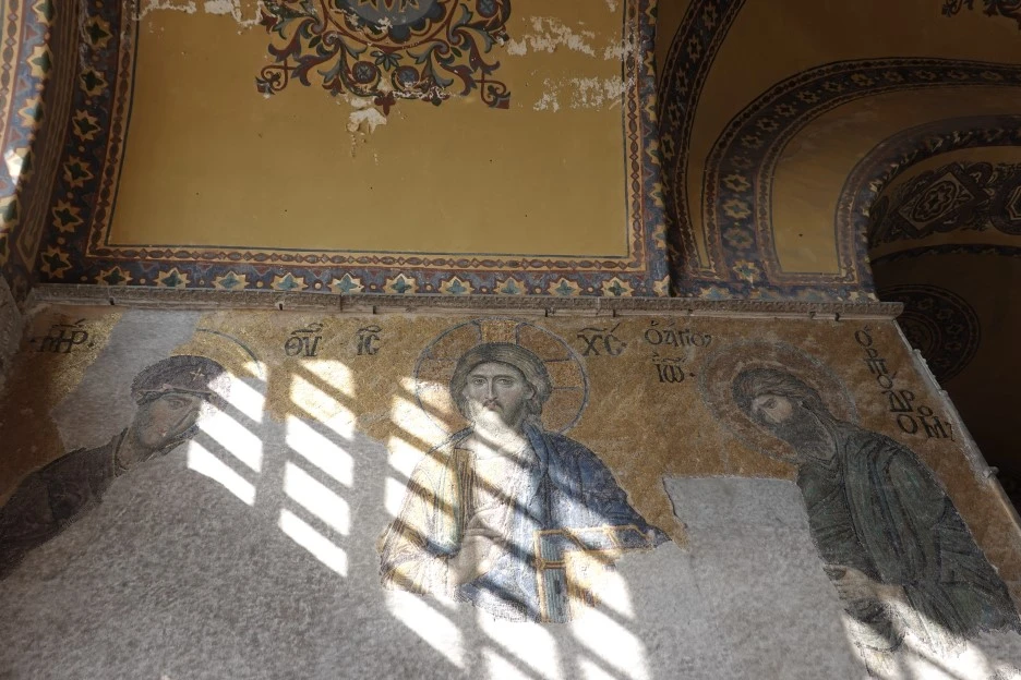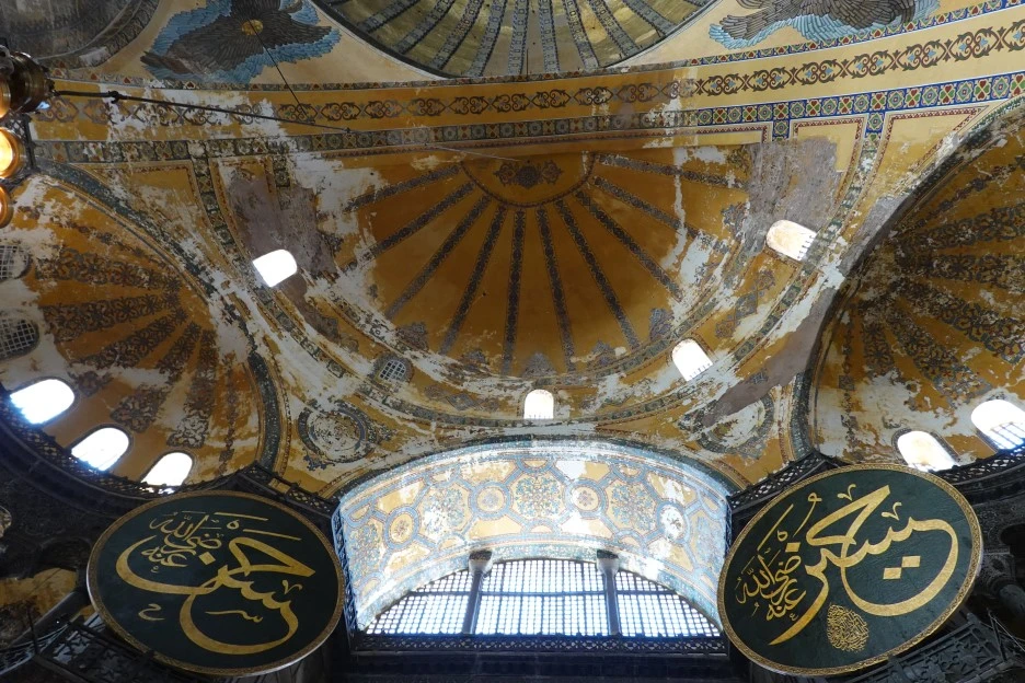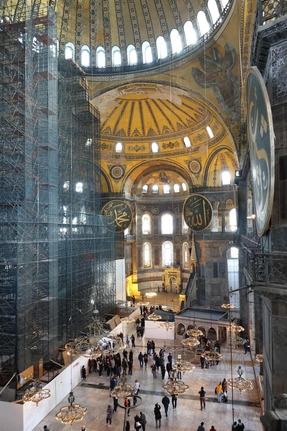 이곳이 동로마 제국의 수도 콘스탄티노플로 호칭되고 있을 때에 그리스도교의 대성당으로 지어졌고, 터키 지배 때에는 이슬람의 모스크가 되었고, 현재는 박물관으로 쓰인다. 콘스탄티누스 대제(大帝)가 ‘성스러운 예지(叡智)’(하기아 소피아)에 바친 구당(舊堂)(325) 대신에 537년 유스티니아누스 황제에 의하여 새로운 구상으로 재건되었다. 안 길이 81m, 너비 70m의 광대한 3랑(廊) 바실리카 플랜과, 지름 약 33m의 거대한 원개(圓蓋)를 교묘히 조합시킨 절충적인 원개 바실리카식 성당이다. 본당(nave) 중앙에 4개의 대지주를 세우고 그 위에 대형 아치와 펜덴티브 구법(構法)에 의한 대원개를 덮고 있다. 동서의 긴 방향으로 가해지는 횡압(橫壓)을 대소의 반원개(半圓蓋)로 받치고, 남북 방향의 횡압은 대지벽(大支壁)(563 증설)으로 받친 매우 독창적인 구조를 하고 있다.