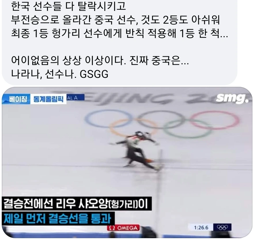 1000m 남자 쇼트트랙 편집본. 결국 강제 판정 후, 중국 1등 그리고 헝가리 선수가 2등. 허 참....