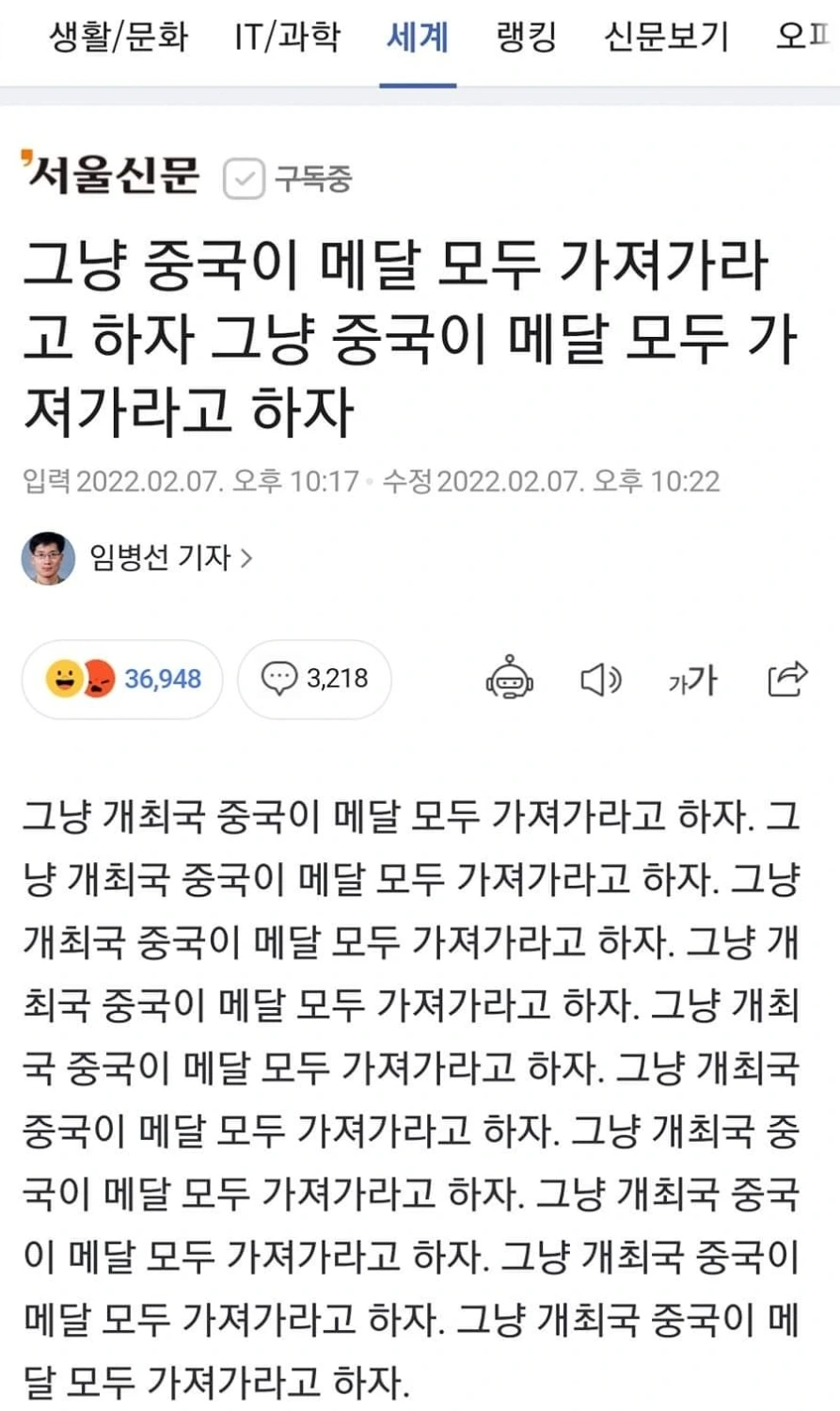 또한 이 기사는 세로로 읽어봐도 '그냥 중국이 메달 모두 가져가라고 하자'로 일치하여, 세로드립 또한 완벽했다는 찬사가 이어졌다(관련기사 링크).