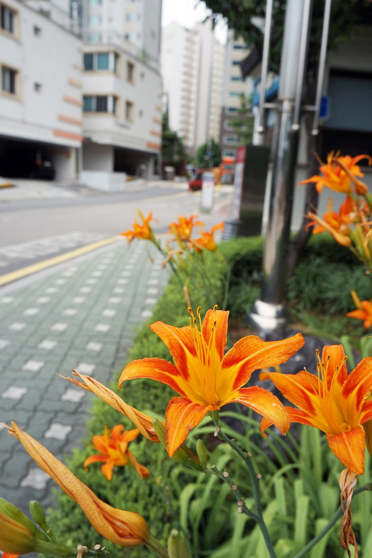 원추리를 만나는 방법 : 도시에서 원추리를 마주치기 가장 좋은 장소는 길가에 조성된 화단입니다. 꽃이 큼직하고 색깔도 눈에 확 띄니 길을 걷다 마주치지 않기가 어렵습니다. 공터나 천변에서도 흔하게 볼 수 있는 꽃입니다.