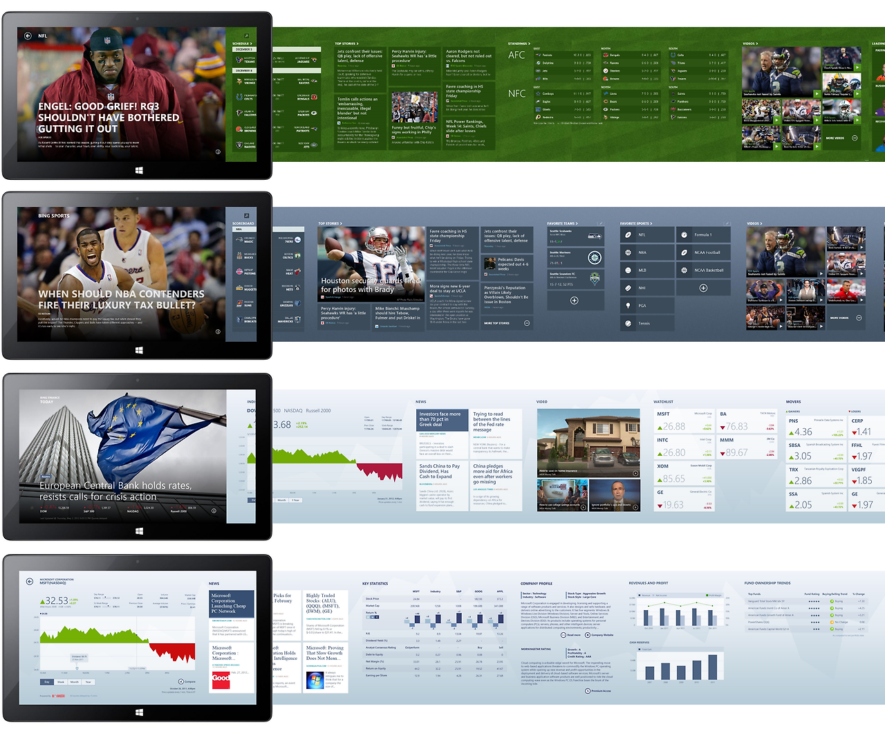 다행히 우리팀의 앱 들은 좋은 반응을 얻었는데, 예를 들면 CNet에서는 파이낸스, 스포츠, 날씨 앱들은 윈도우즈 8용 앱 들중 가장 잘 디자인되고 효율적인 앱이라고 평가했으며, Wired 등에서도 우리의 Bing/MSN앱들이 메트로 디자인이 어떻게 활용되어야 하는지를 보여주는 좋은 사례라고 평했다. 디자이너로서 뿌듯한 순간이 아닐 수 없었고, 엔지니어로서의 직장을 그만두고 디자인을 공부하고 전향한 보람을 느낄 수 있는 순간이었다.