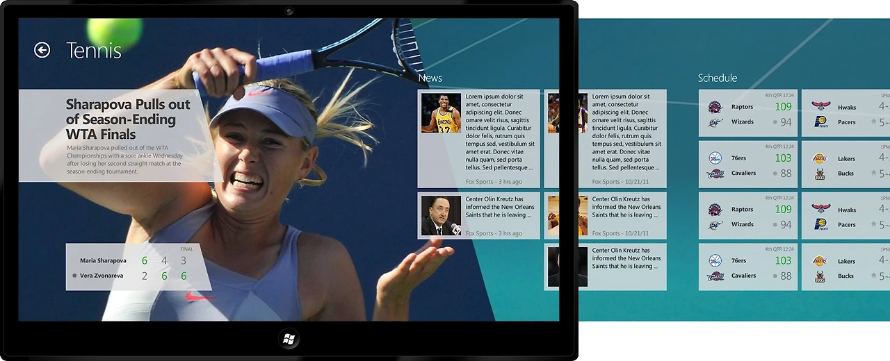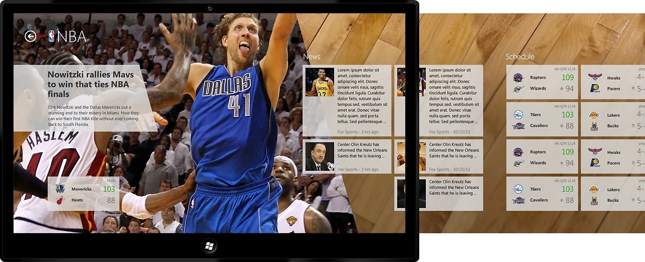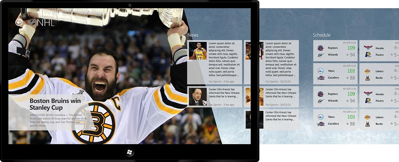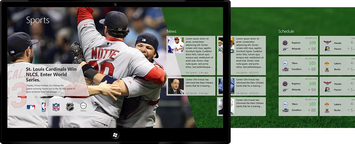 이런 식의 강렬한 시각 이미지와 타이포그래피를 각 앱의 시작화면에 가져오면 어떨까 하는 생각에 디자인 작업을 해 보았다. 스포츠와 금융 앱에 그날의 하이라이트에 해당하는 헤드라인 기사와 관련된 고해상도 이미지를 구해 첫 페이지에 배치하고 강렬한 타이포그래피 작업을 해 보았는데, 결과는 상당히 만족스러웠다. 기존 앱들이 다양한 크롬(테두리 및 UI 요소 등 콘텐츠를 둘러싼 영역들)에 둘러싸여 콘텐츠 자체가 뒤로 물러나 있던 느낌이라면, 이 디자인에서는 콘텐츠가 전면에 드러나고 매거진을 보는 듯한 강한 몰입감과 시각적인 인상을 주었다. 메트로 디자인 원칙들 중 Content is King, Content over Chrome이라는 요소와 딱 들어맞는 방향이었다.