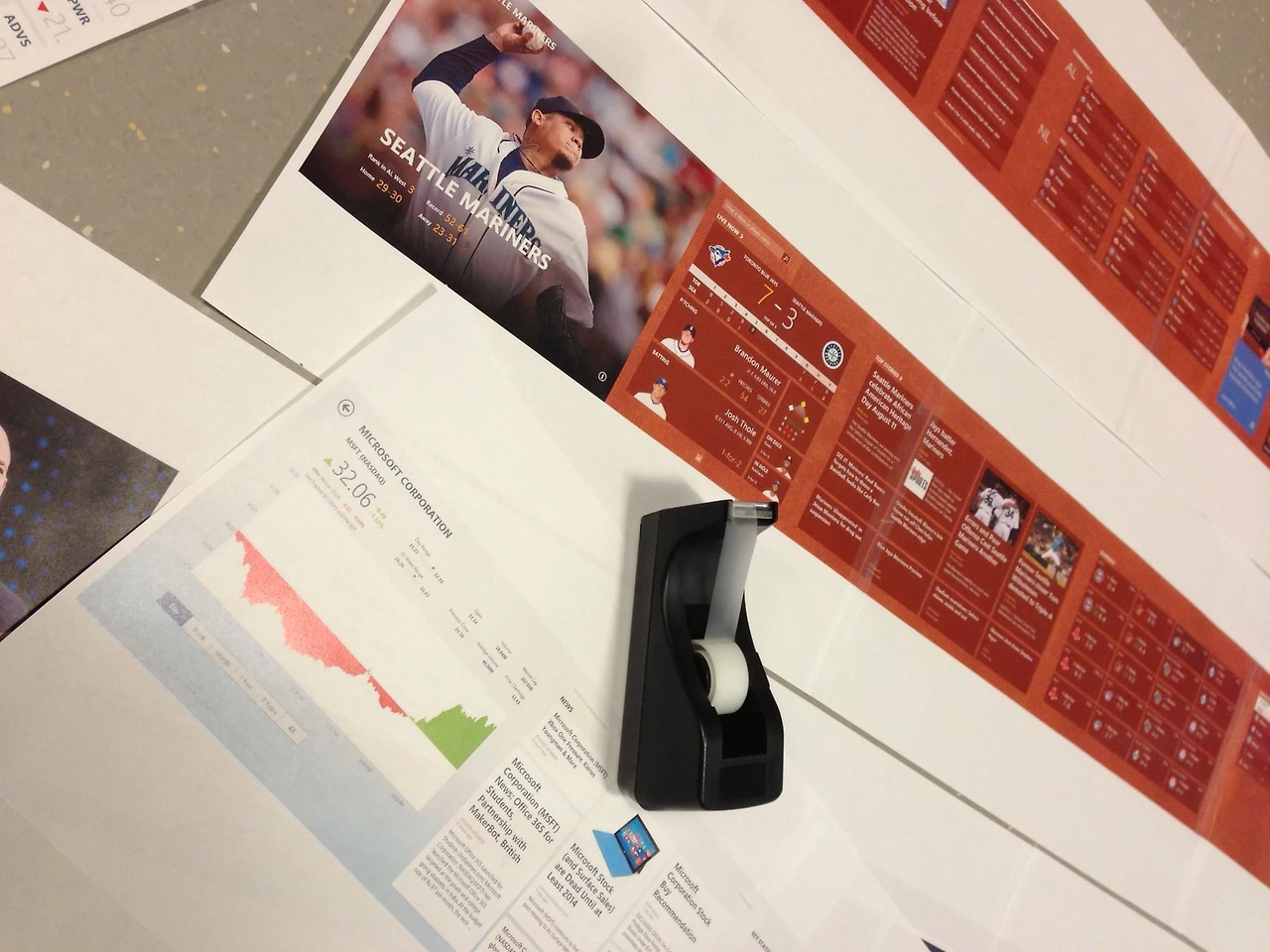 스포츠와 금융 앱의 디자인을 담당하게 된 후로 퇴근 후와 주말 시간에 동네에 있는 Barnes & Noble 서점에 들러 다양한 관련 매거진 들을 살펴보았다. 일반적인 서적과는 다르게 매거진이 갖는 독특한 매력이 무엇인가에 대해 생각해보니 전체 페이지를 사진으로 과감하게 채우는 방식과 큼지막한 헤드라인 텍스트의 오버레이 레이아웃 등을 통해 정보 전달 목적보다 시각적인 임팩트와 감성적인 자극을 극대화한다는 점이었다. 이러한 매거진들은 우리가 가로로 넘기며 훑어보며 이미지를 소비하고 흥미를 끄는 주제가 있으면 헤드라인 밑의 좀 더 자세한 텍스트들을 살펴보는 방식으로 윈도우즈 8의 앱이 추구하는 방식과 닮았다고 볼 수 있었다.