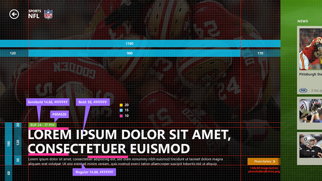 다양한 뉴스와 데이터가 콘텐츠의 중심이 되는 앱인 만큼, 텍스트의 중요성은 더욱 높았다. 콘텐츠의 가독성, 정보의 위계 구조, 사용성과 더불어 만족감을 주는 사용자 경험을 위해서는 일관성 있고 효율적인 타이포그래피의 시스템적인 적용이 매우 중요했다. 우리는 윈도우즈 팀에서 제공한 기본 타입 램프를 우리의 앱이 제공하는 콘텐츠에 알맞게 보완을 했고, 개발팀과 협업을 통해 이런 타입 시스템이 일관성 있게 잘 적용될 수 있도록 노력했다.