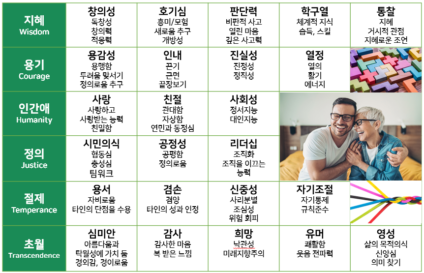 연구원들은 세계의 주요 종교와 철학에 관한 기본적인 저술들을 읽고 공통적인 미덕을 정리하고 그 미덕이 세계 모든 문화권에서 인정하는 것인지 검토를 합니다. 그렇게 탄생한 6가지 미덕은 '지혜, 용기, 인간애, 정의, 절제, 초월'입니다. 아리스토텔레스, 플라톤, 아퀴나스, 아우구스티누스와 같은 철학자들의 저술과 구약성서, 탈무드, 불경, 코란과 같은 경전, 공자, 노자, 벤저민 프랭클린의 저술, 일본의 사무라이 무사도, 고대 인도의 철학서인 우파니샤드 등을 두루 검토한 후 총 200여 가지의 미덕 목록을 작성했습니다. 그런 과정을 거쳐서 뽑힌 6가지 미덕이니 그 노고가 얼마나 집요하고 컸는지 저는 이 포인트에서 엄청 감동을 받았고 푹 빠져들게 되었습니다.