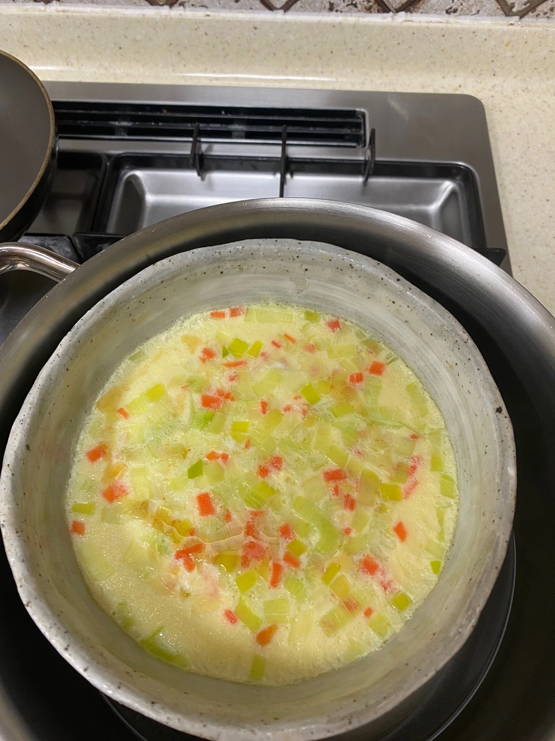 나는 급식에서 나오는 반찬 중에 계란찜을 특히 좋아한다. 뚝배기로 계란찜을 했을 때는 스크램블 에그와 계란찜의 중간 그 어디쯤의 요리를 항상 만들고는 했는데, 물에 중탕으로 계란물을 익히니 급식시간에 나오던 그 부드러운 계란찜을 만들 수 있었다.