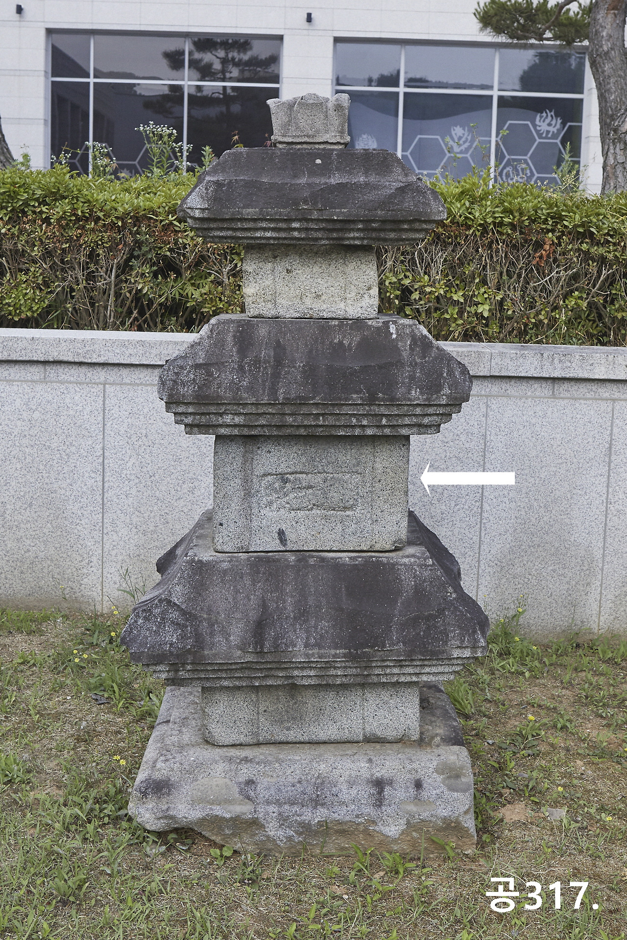 특이하게 이 석탑은 법당 앞에 있지 않고 절 주변의 암반 위에 세워져 있다. 설명을 읽어보면 지붕돌인 3층 옥개석은 계곡에서 찾아 복원하였고 탑신석은 새로 만들었다고 쓰여 있는데, 여기서 옥개석이란 아래 왼쪽 사진과 같은 탑 지붕을 말한다.