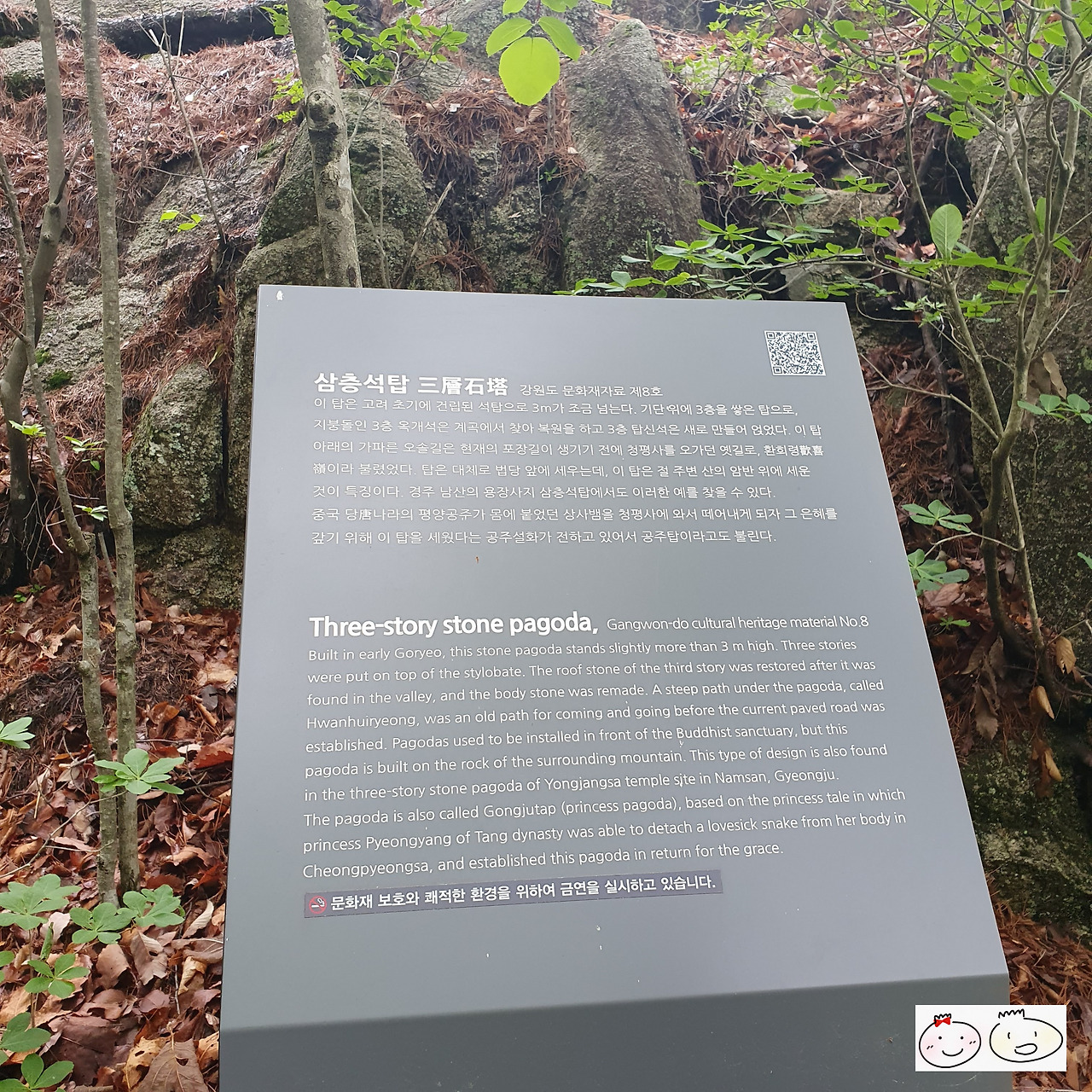 그래도 석탑까지 가는 길이 지루하지는 않아서 다행이었다. '공주와 상사뱀' 설화, '거북바위' 설화, 그리고 정말 구송폭포 근처에 아홉 그루의 소나무가 있는지 세다 보면 금방 삼층석탑에 도착할 수 있다. 어떻게 보면 설화의 길이라고도 할 수 있겠다. 풍경이 있고 이야기가 만들어졌겠지만, 오히려 이야기가 있음으로 인하여 그 풍경이 색다르게 보이기도 한다. 특히 '공주와 상사뱀' 설화는 청평사 삼층석탑과도 관련이 깊다.