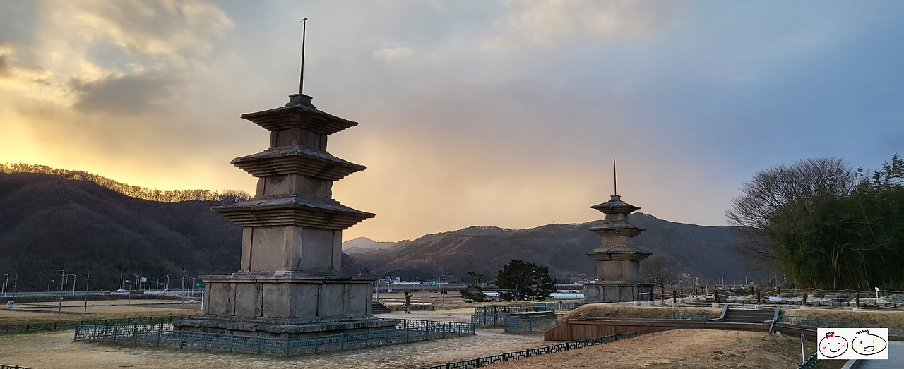 감은사지는 경주의 다른 관광지와는 다르게 주변에는 아무것도 없다. 굳이 이것을 보러 여기까지 와야 하나 싶지만 문무대왕릉을 향하는 길에 이 감은사지가 있어서 중간에 잠깐 들르기 좋다. 탑 근처는 논밭과 가끔 들리는 개 짖는 소리가 우렁찰 뿐이다. 겨울이면 다소 황량한 이 풍경이, 노을이 질 때면 오히려 충만감으로 가득 찬 느낌을 준다. 겨울 논에는 벼도 이삭도 없지만 마치 풍작인 것처럼 황금색으로 가득 물든듯했다.
