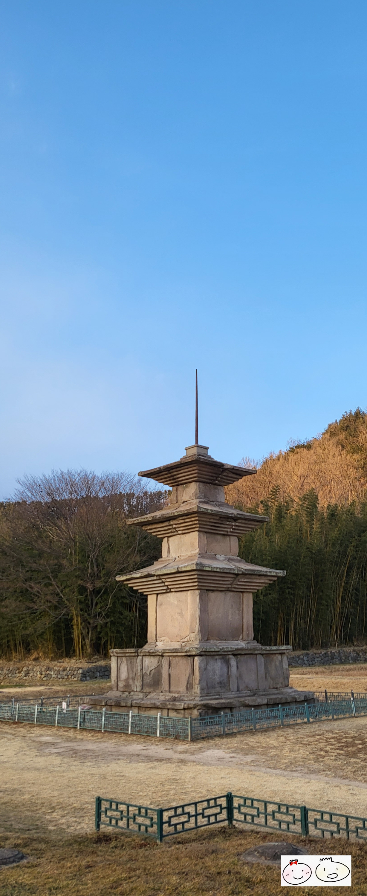 멀리서 봤을 때는 굉장히 상태가 좋아 보였는데 막상 가까이서 보니 부서진 곳이 많아서 아쉬웠다. 석탑 뒤로 보이는 나무들은 바람에 흔들릴지언정 다음 해에는 또 색색의 잎을 피우는데 반해 굳건해 보이는 돌은 풍파를 이겨내지 못한 것 같이 보였다. 괜히 아쉬운 마음이 든다.