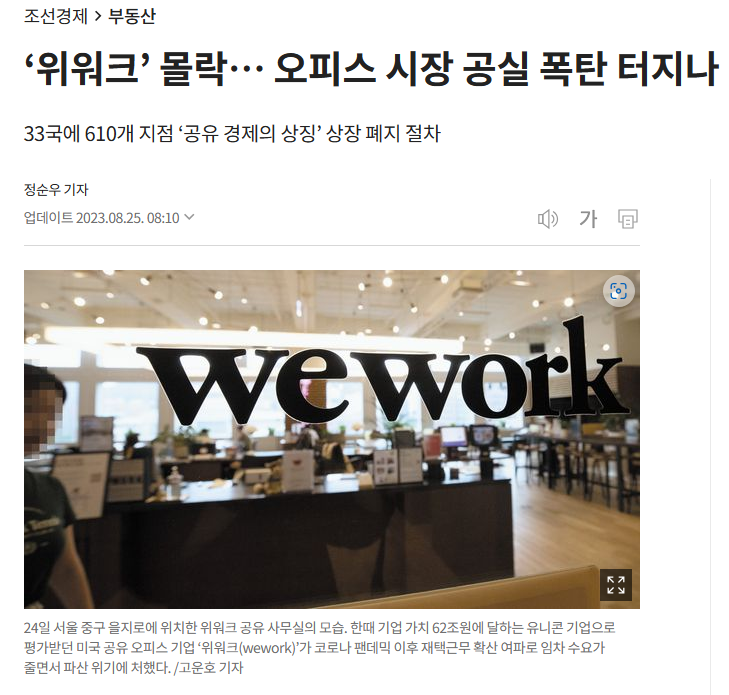 최근 세계적인 공유 오피스회사인 Wework의 몰락을 우려하는 기사가 보도되었다. 요즘 어려운 시장상황에 대한 기사가 수도 없이 쏟아져 대수롭지 않게 여겨졌을수도 있으나, 7년 전 Wework과의 인연 때문인지 관심이 갔다.