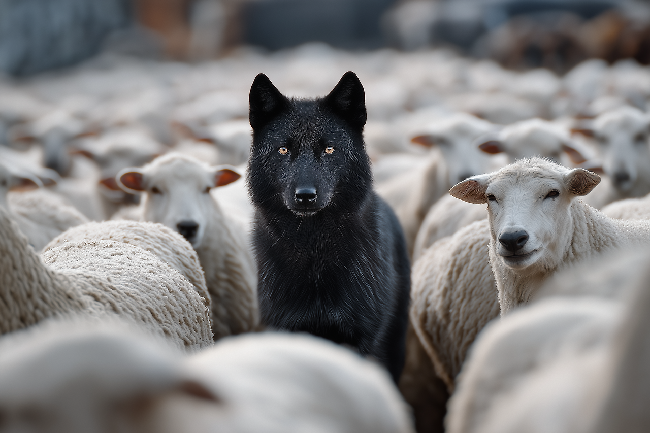 Prompt : a shot from a distance, Lone pitch-black wolf standing among a dense flock of white sheep, piercing gaze, resilience, leadership