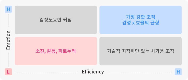 위 이미지는 감성 x 효율 매트릭스로, 네 가지 조직 유형을 <정서적 감수성(Emotion)>과 <업무 효율성(Efficiency)>을 통해 설계하고 있는지를 기준으로 설명하고 있다. 즉, 최 우상단에 있는 조직이, 감성과 효율의 균형이 만들어내는 창의적이고 지속가능한 몰입 구조를 지니고 있다. 감성 x 효율 균형이 작동하는 곳에서, Creative Hybrid 조직이 탄생한다. 구조적 몰입을 만들려면 일방향의 효율이 아닌, 자기 갱신이 가능하도록 만드는 것이 중요하다.