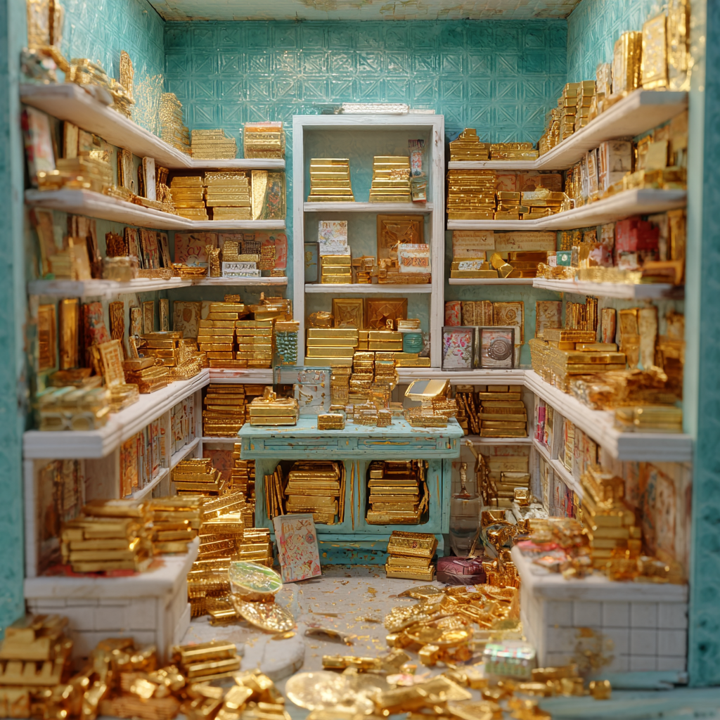 Prompt : Make an image of a very small room, but filled with gold bars coins, jewelry, gems and lots and lots of crunchie candy bars. All on the shelves that are white with teal colored walls