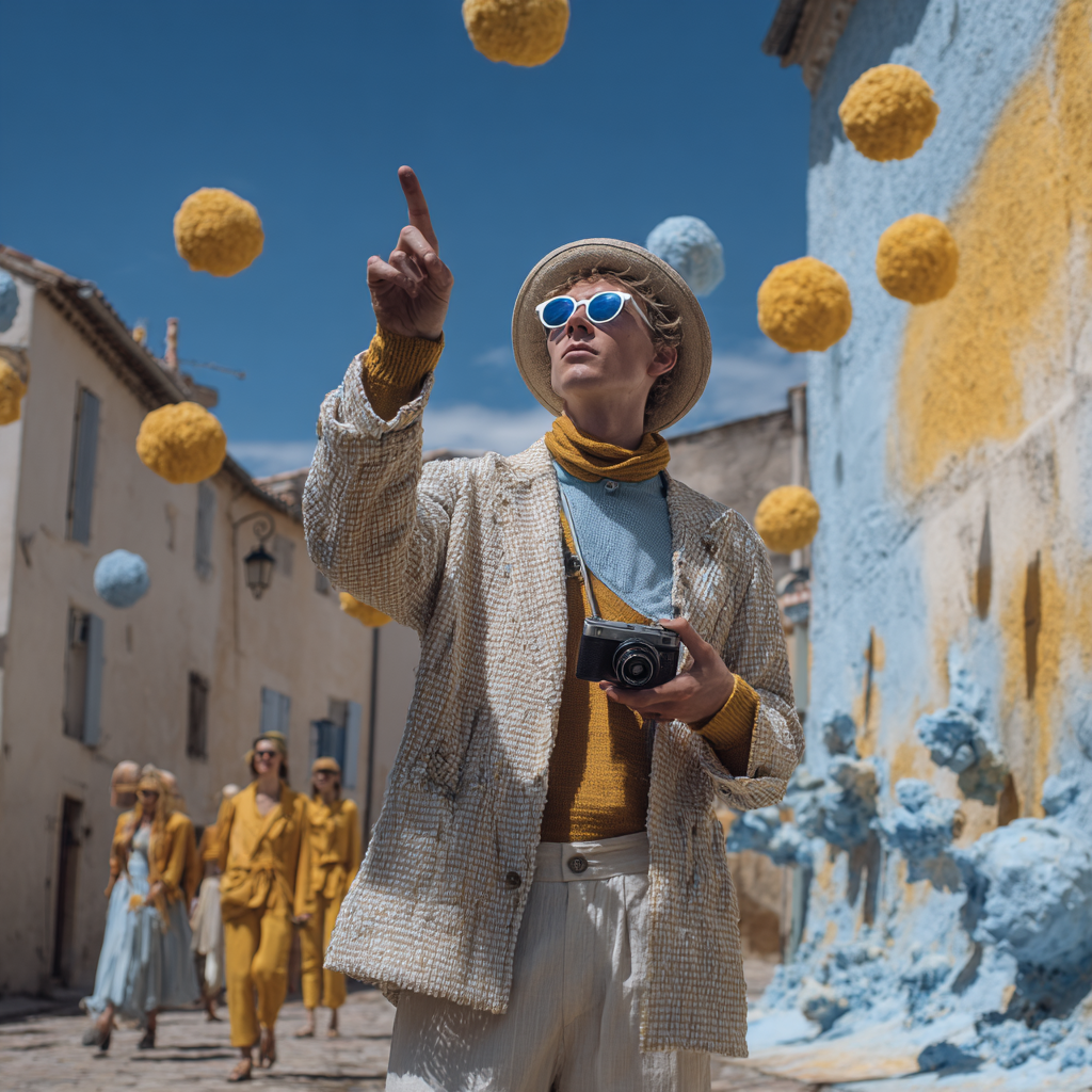 Prompt : A street scene in southern France. Zest stands in front of a street wall with pale yellow and powder blue colors, holding up a camera with one hand and pointing his other finger at the sky. In the background there are lemon art installations or fashion models walking on the street.