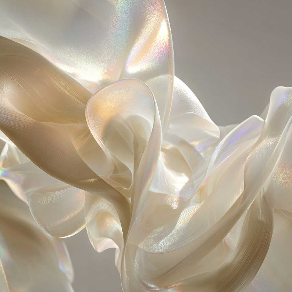 Prompt : An ethereal, abstract composition featuring soft, flowing translucent ribbons or waves suspended in a creamy beige and ivory atmosphere. The forms are glass-like and fluid, with delicate curves and folds, resembling water and air elements merged. Light filters gently through the space, casting soft shadows and subtle, iridescent rainbow reflections across the surfaces. The aesthetic is dreamy, minimal, serene, and otherworldly--evoking a sense of weightlessness, calm, and sacred stillness.