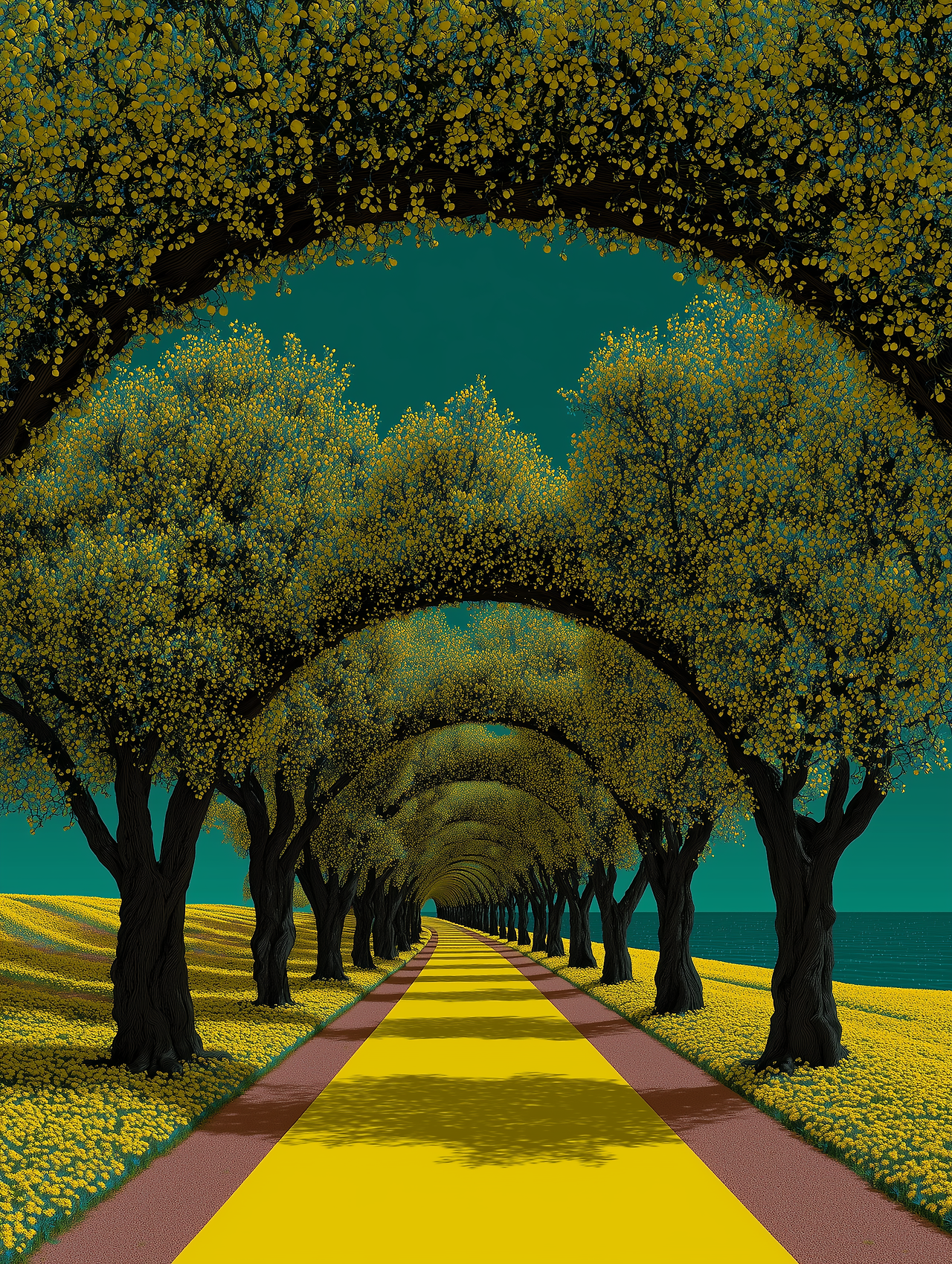 Prompt : A wide angle technicolor 1950 abstract surreal image of a big arch made of fig trees, lemon trees, almond trees, a yellow road goes to a pastel green sea, pastel blue sky, yellow sun, Mediterranean , dslr, depth of field