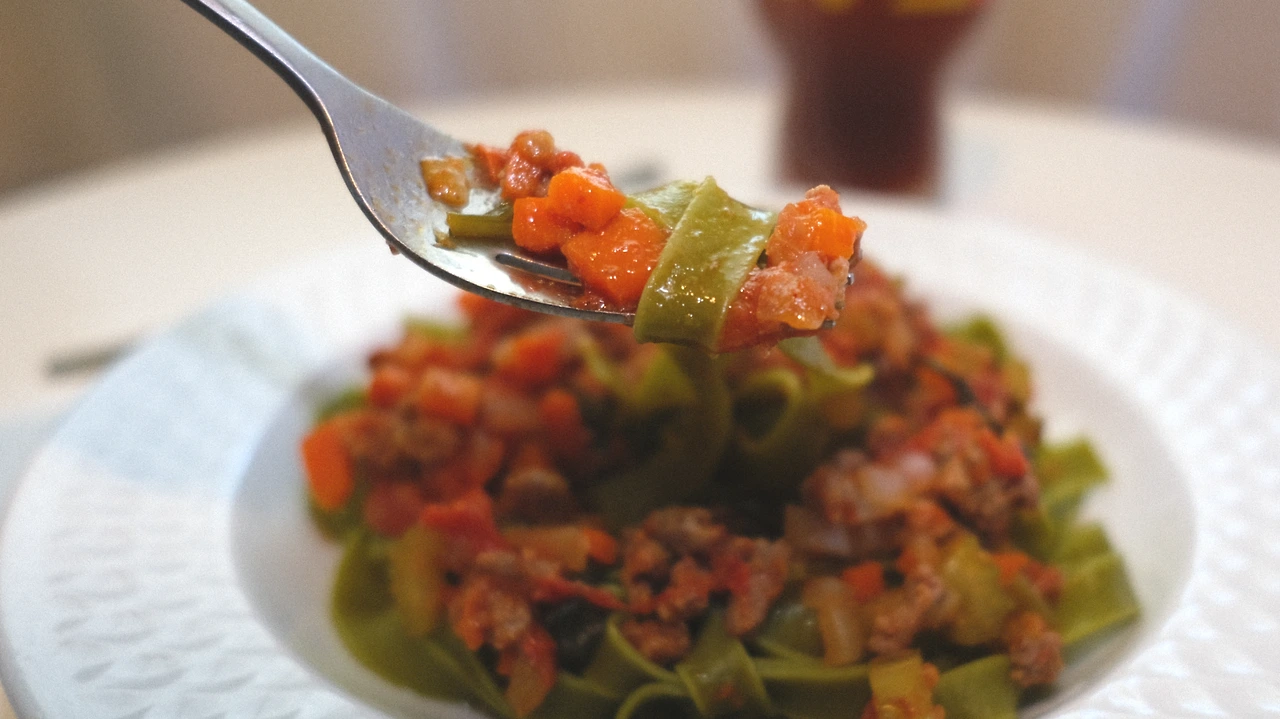 한 시간 만에 완성된 라구 소스와 시금치 파스타 면. 먹기 직전 파스타 면에 올리브오일 한 스푼을 두르고 라구 소스를 넉넉히 얹었다. 면과 소스를 섞어서 한 입 먹어보았다. 부드러운 면과 사이사이로 식감이 살아있는 야채, 고깃덩어리가 팡팡 터진다. 담백하면서 다양한 식감과 맛이 어우러져 지루하지 않다. 전통 레시피에서는 몇 시간 동안 푹 삶는다고 한다. 한 시간만 조리하니 걸쭉한 소스라기보다는 간짜장처럼 면과 볶은 야채를 비벼 먹는 느낌이 든다.