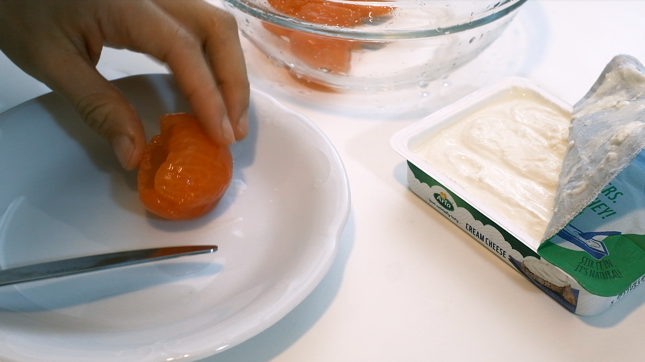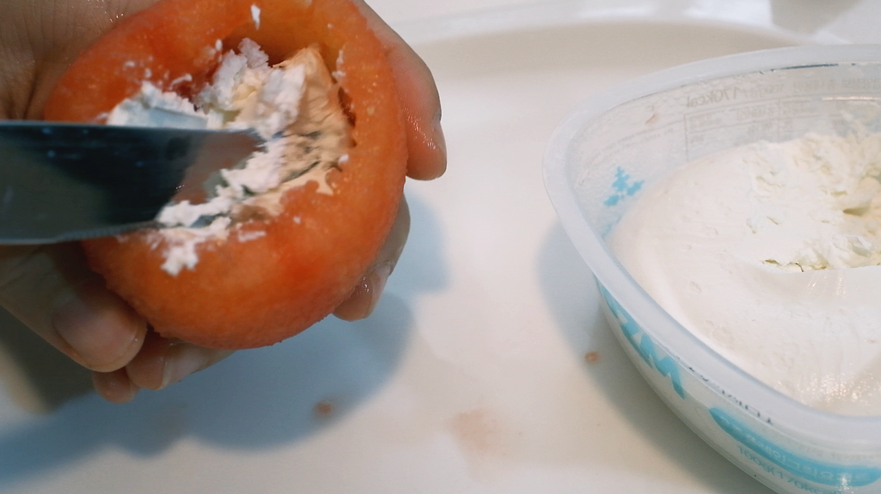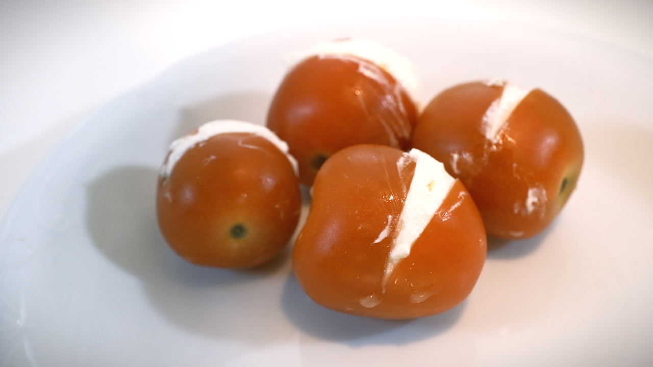 토마토 중간에 칼집을 2/3 내고 크림치즈를 넣는다. 하얀 이를 드러내고 웃는 모습이다. 자르고 넣는 시간 10초면 충분하다. 또 다른 방식도 있다. 끓는 물에 토마토를 데치고 껍질을 벗긴다. 속을 파내고 그 자리에 크림치즈를 채운다. 냉장고에 넣어두고 차가운 상태로 먹으면 더 맛있다.
