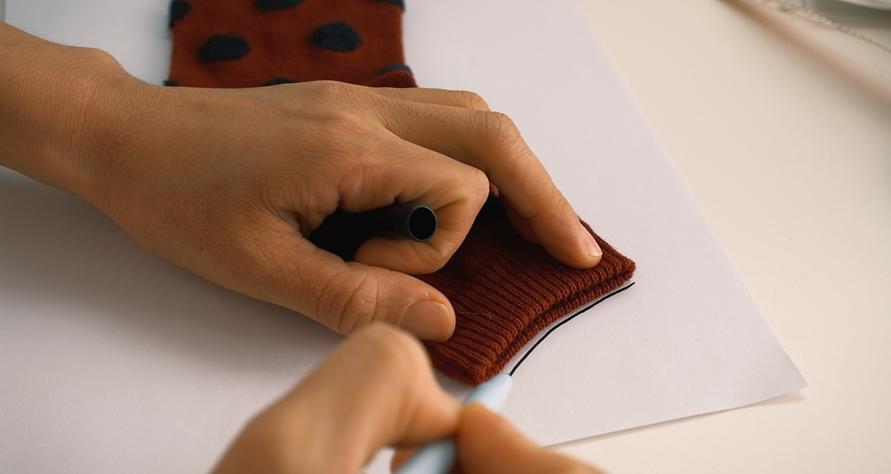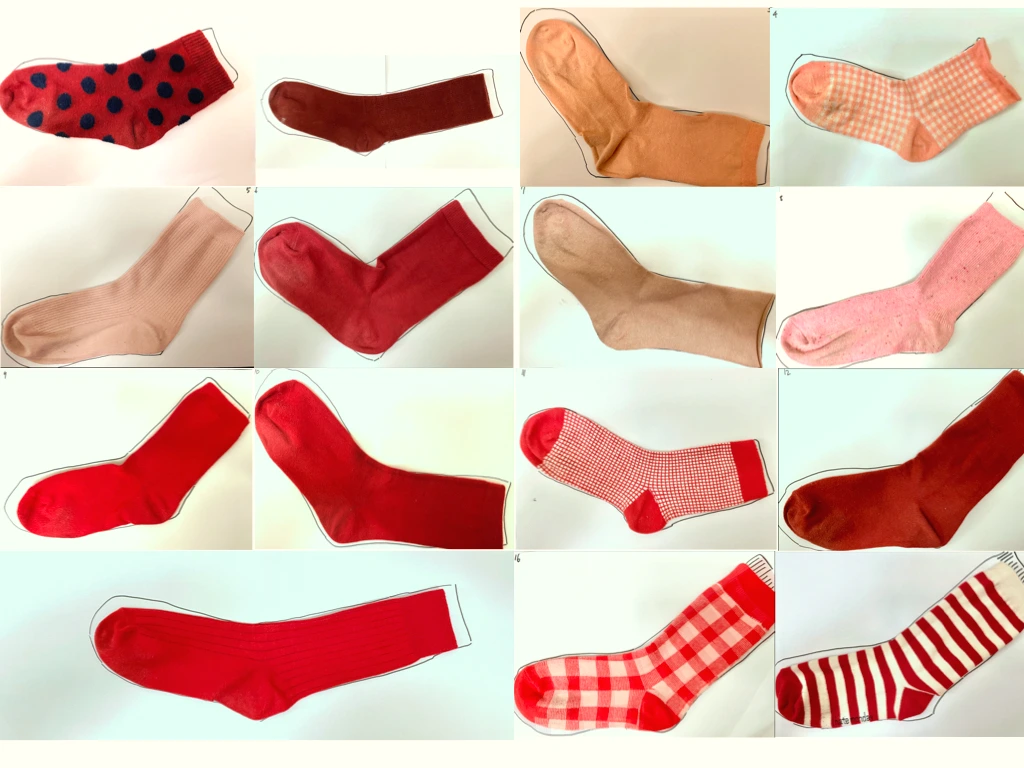 만 원 이하, 온오프라인에서 쉽게 구할 수 있는 빨간색 양말 17켤레를 구입했다. 세탁 전후를 비교하기 위해 A4용지를 대고 외곽선을 따라 그렸다.